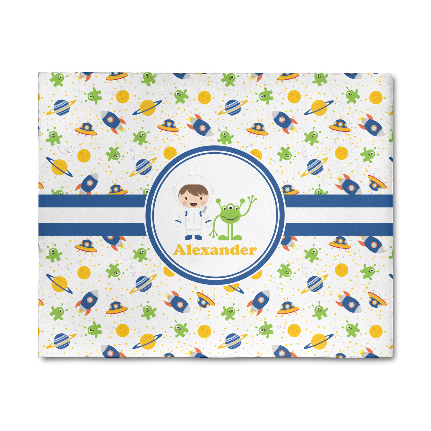 A blue and white band is placed in the middle of the design and used to showcase your little space traveler and his martian buddy. Add your own personalization for that special touch.