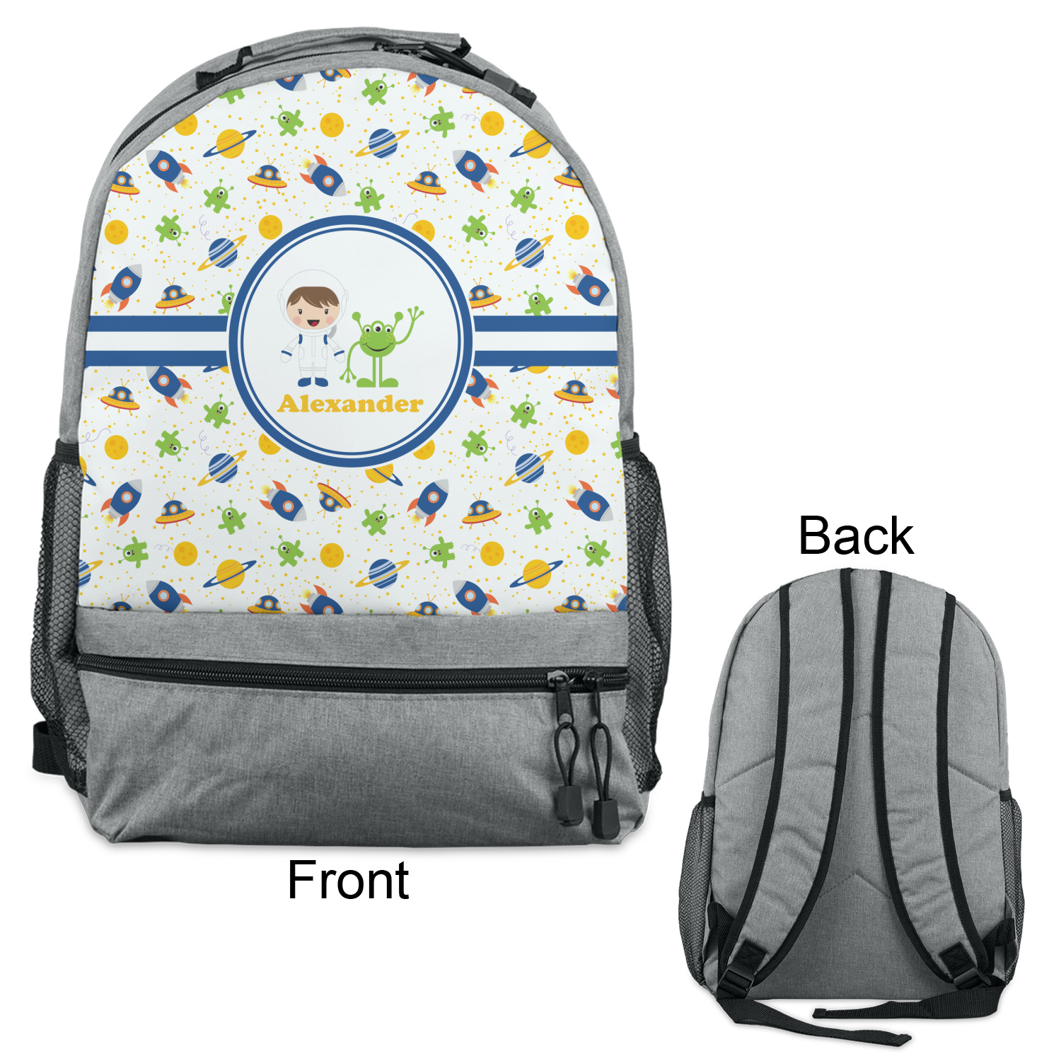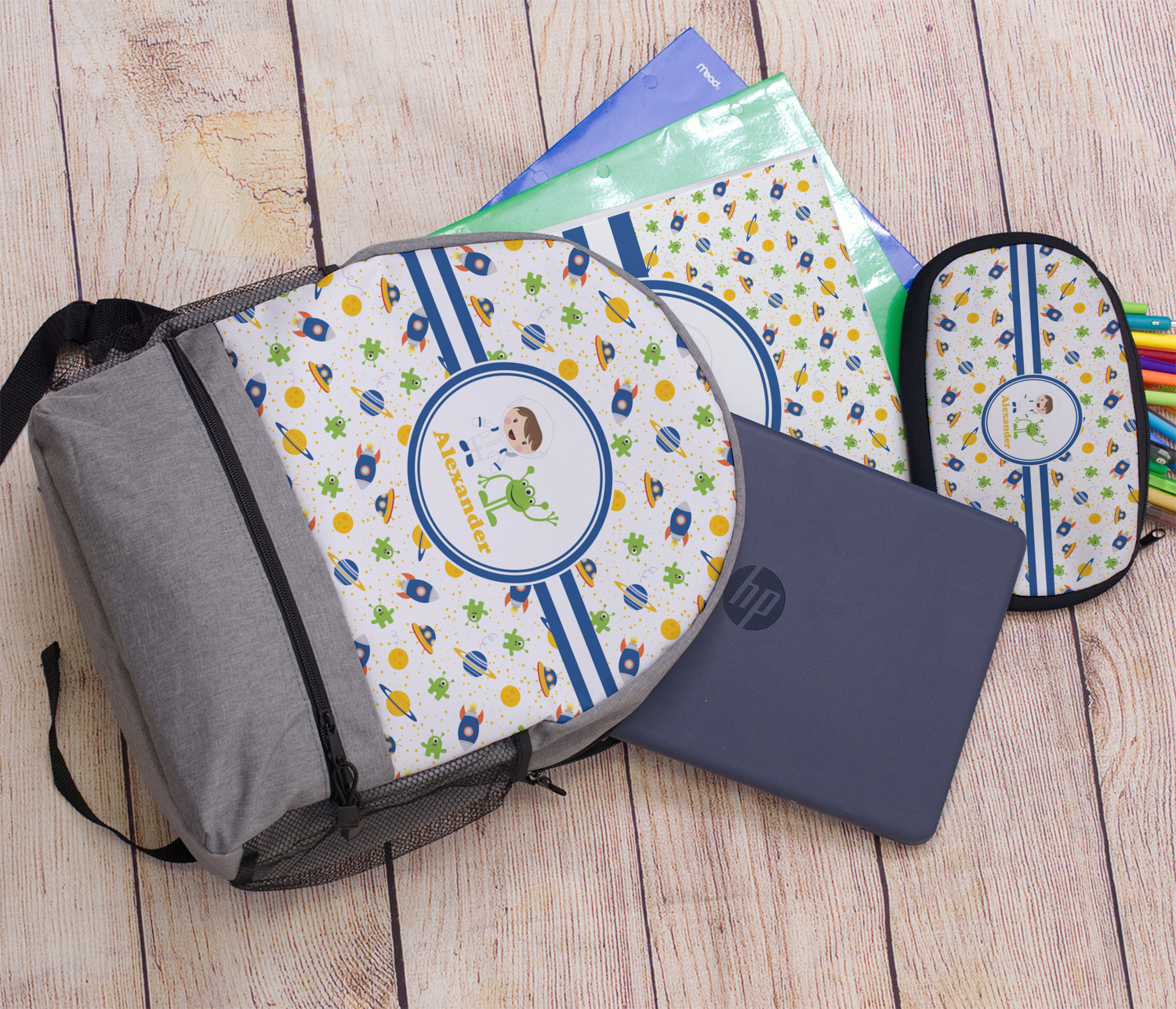 A blue and white band is placed in the middle of the design and used to showcase your little space traveler and his martian buddy. Add your own personalization for that special touch.