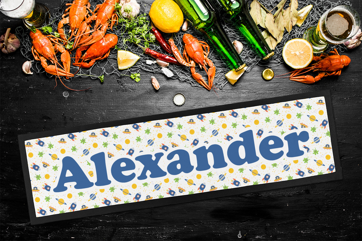 A blue and white band is placed in the middle of the design and used to showcase your little space traveler and his martian buddy. Add your own personalization for that special touch.