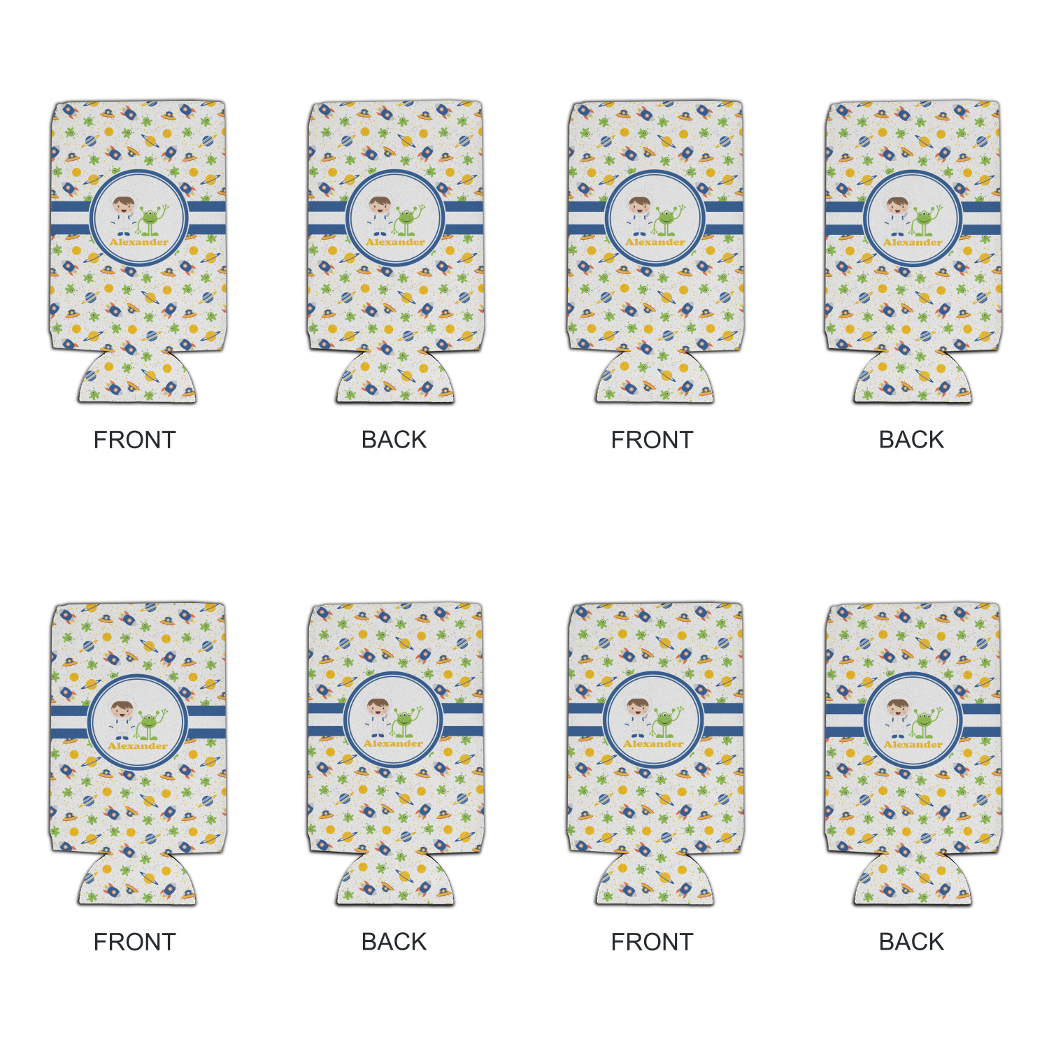 A blue and white band is placed in the middle of the design and used to showcase your little space traveler and his martian buddy. Add your own personalization for that special touch.