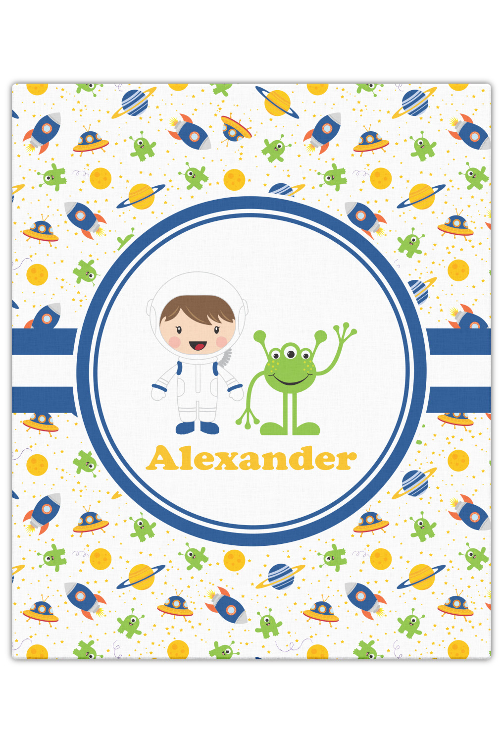 A blue and white band is placed in the middle of the design and used to showcase your little space traveler and his martian buddy. Add your own personalization for that special touch.