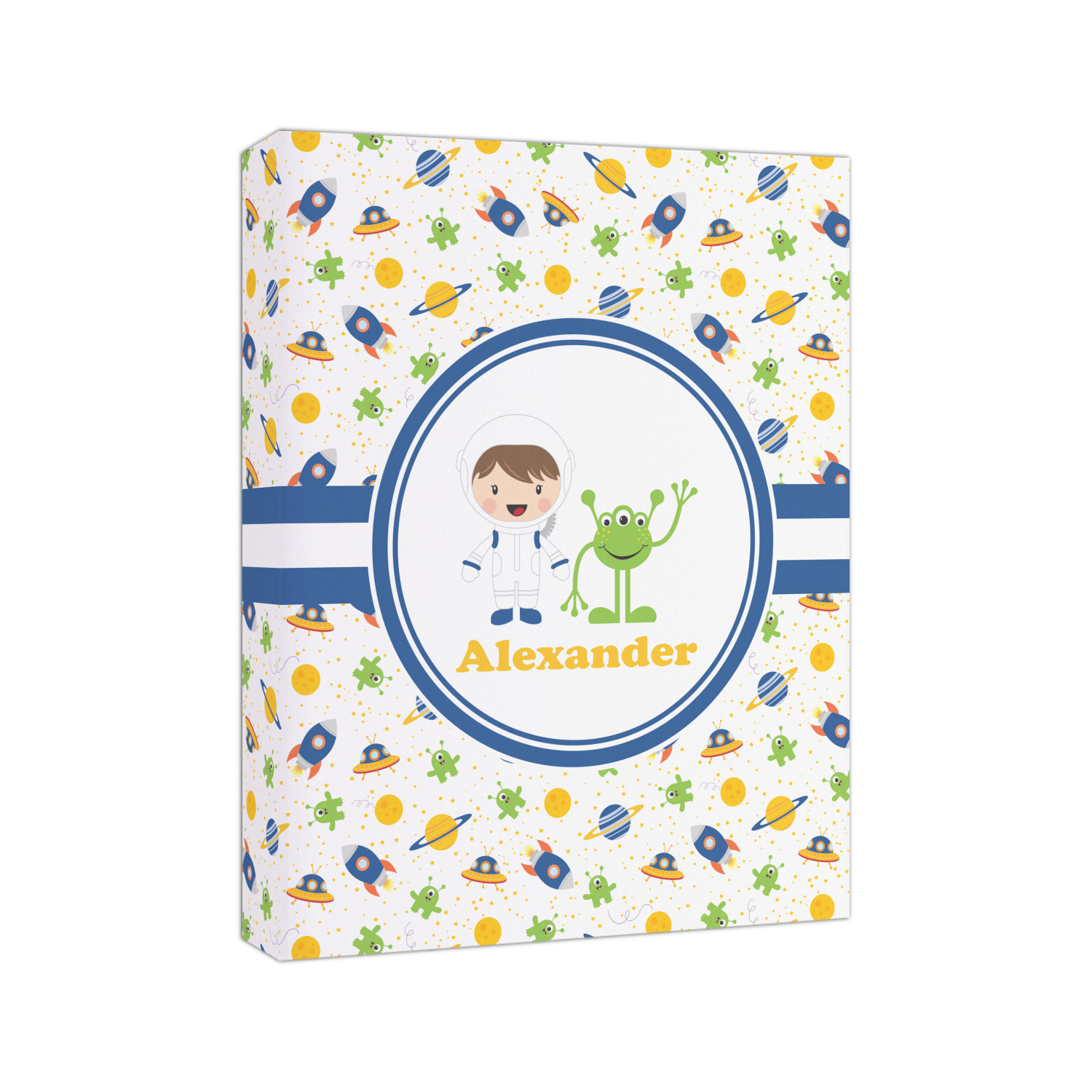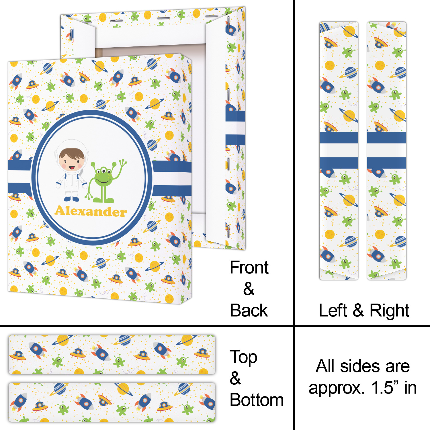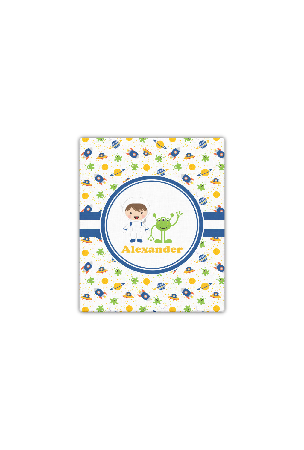 A blue and white band is placed in the middle of the design and used to showcase your little space traveler and his martian buddy. Add your own personalization for that special touch.