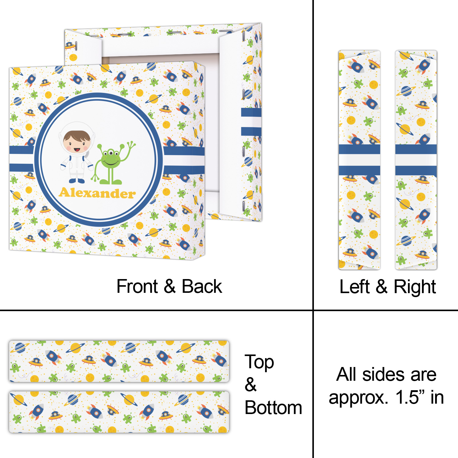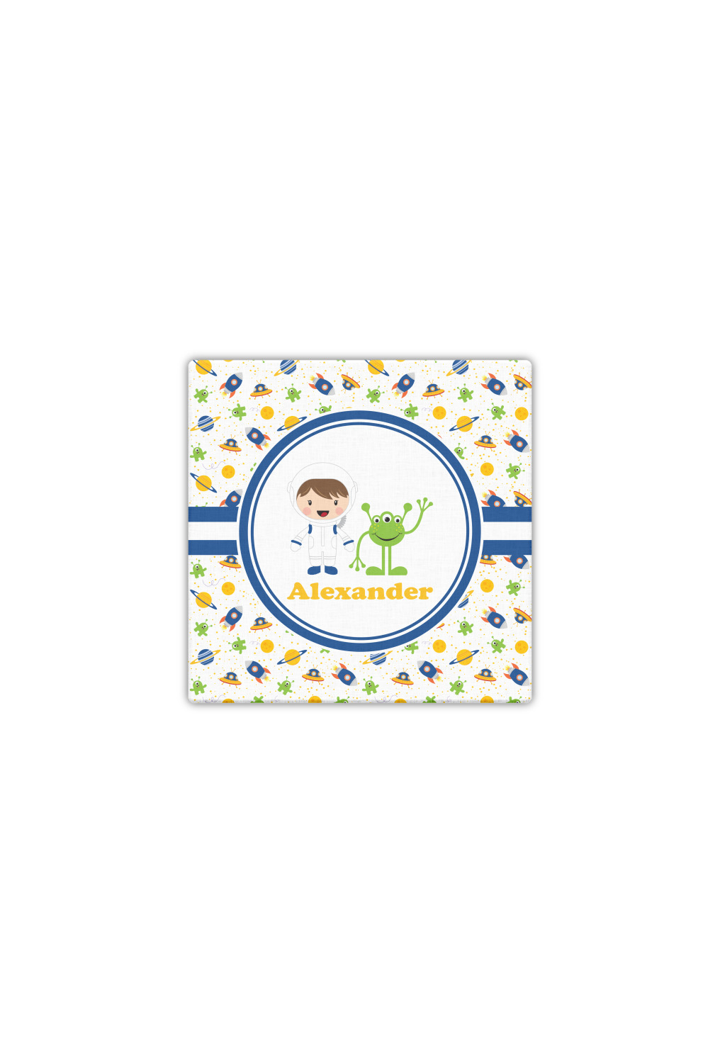 A blue and white band is placed in the middle of the design and used to showcase your little space traveler and his martian buddy. Add your own personalization for that special touch.