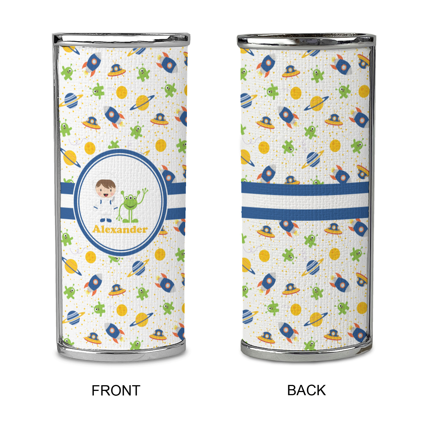 A blue and white band is placed in the middle of the design and used to showcase your little space traveler and his martian buddy. Add your own personalization for that special touch.