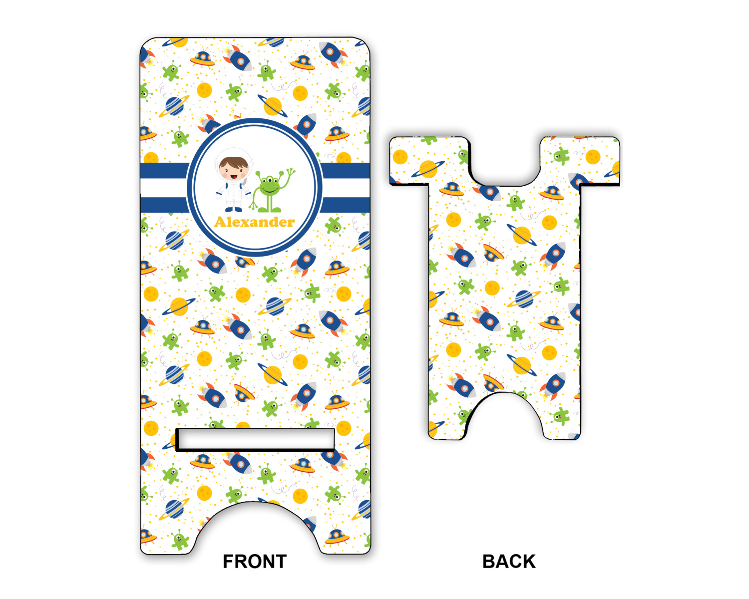 A blue and white band is placed in the middle of the design and used to showcase your little space traveler and his martian buddy. Add your own personalization for that special touch.