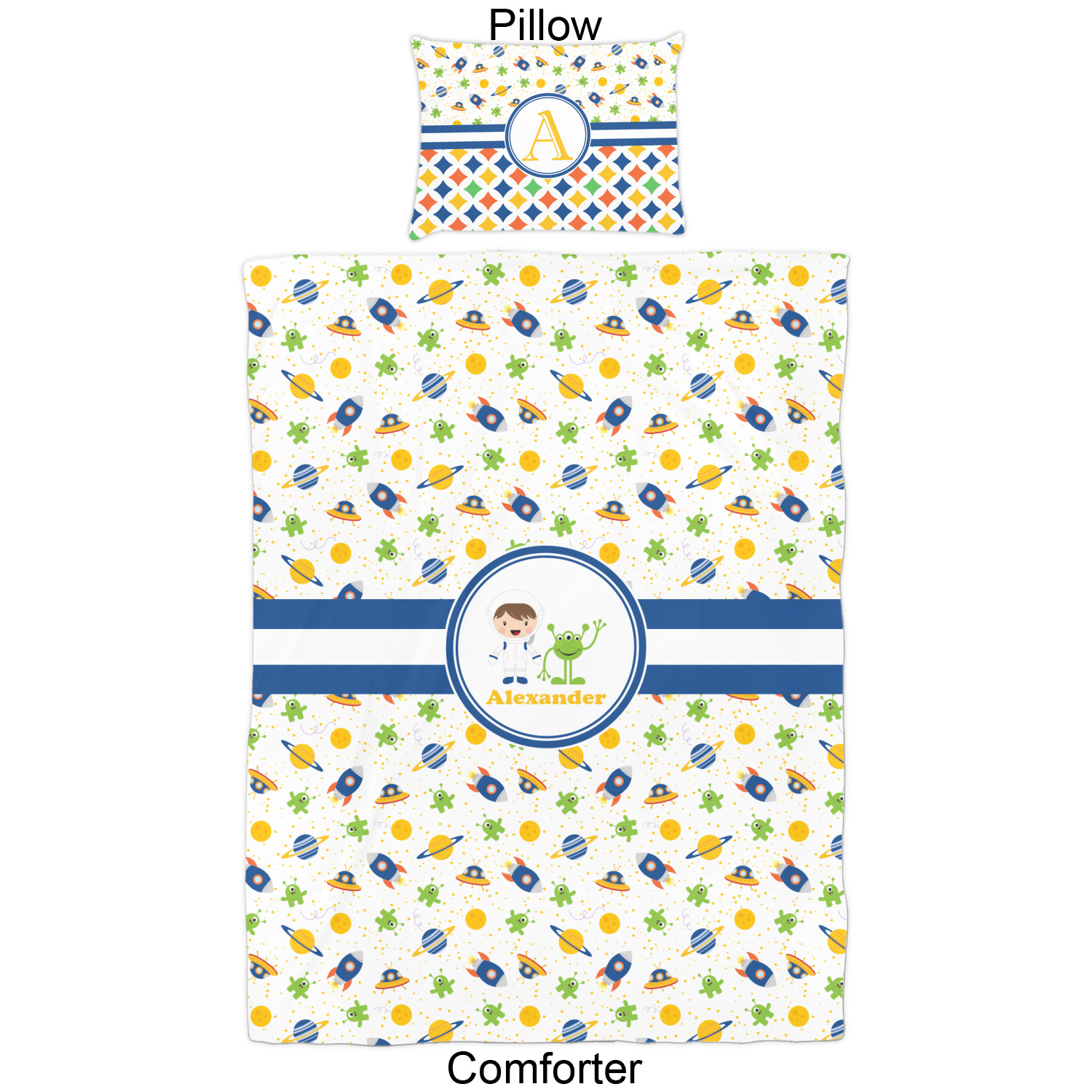 Explore another galaxy with this whimsical space design. Fun colors of blue, orange, yellow, and green make this space exploration come alive. The design is full of little green martians, blue and orange rockets, blue, yellow, and orange spaceships, yellow and blue planets, and yellow stars galore.