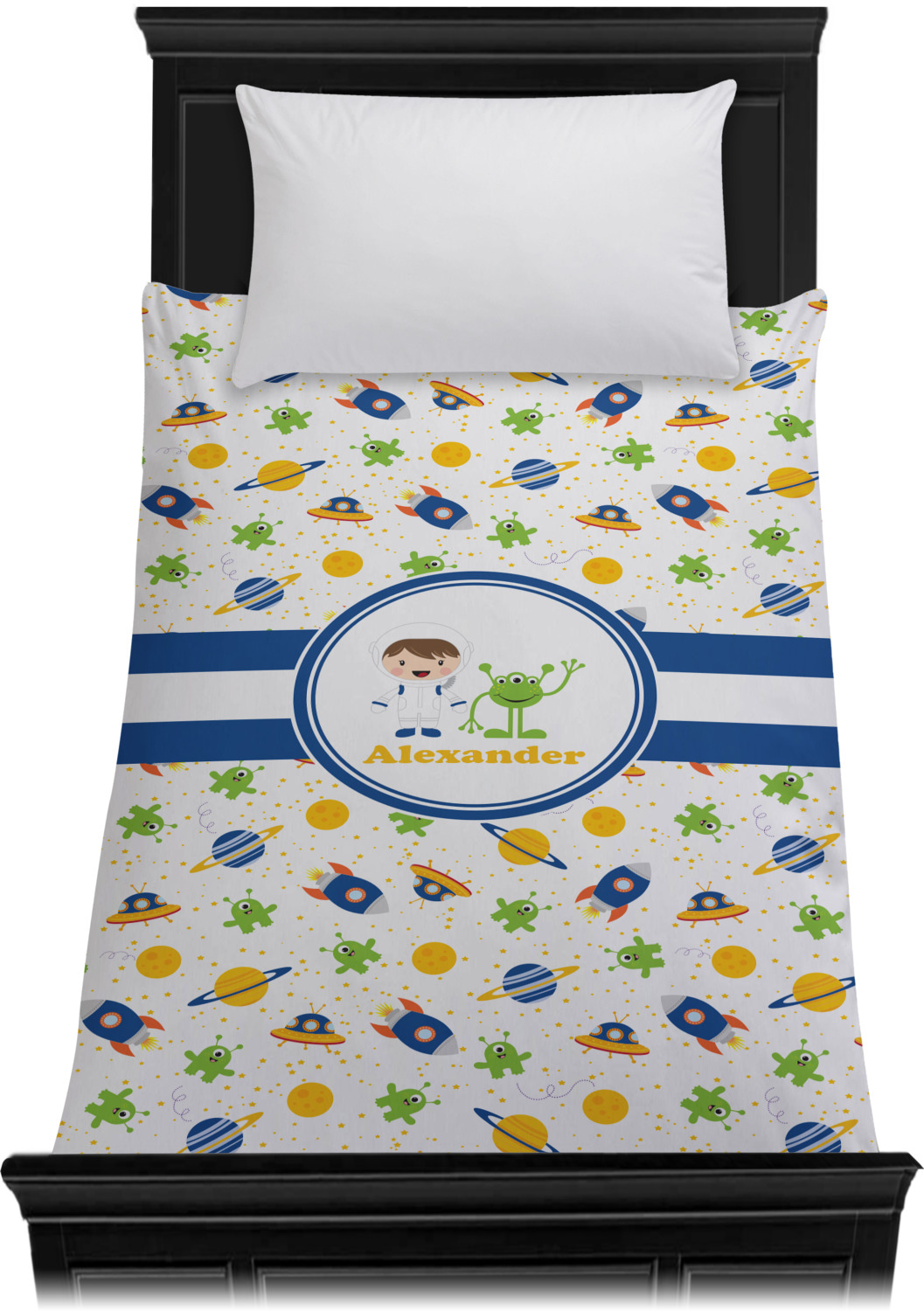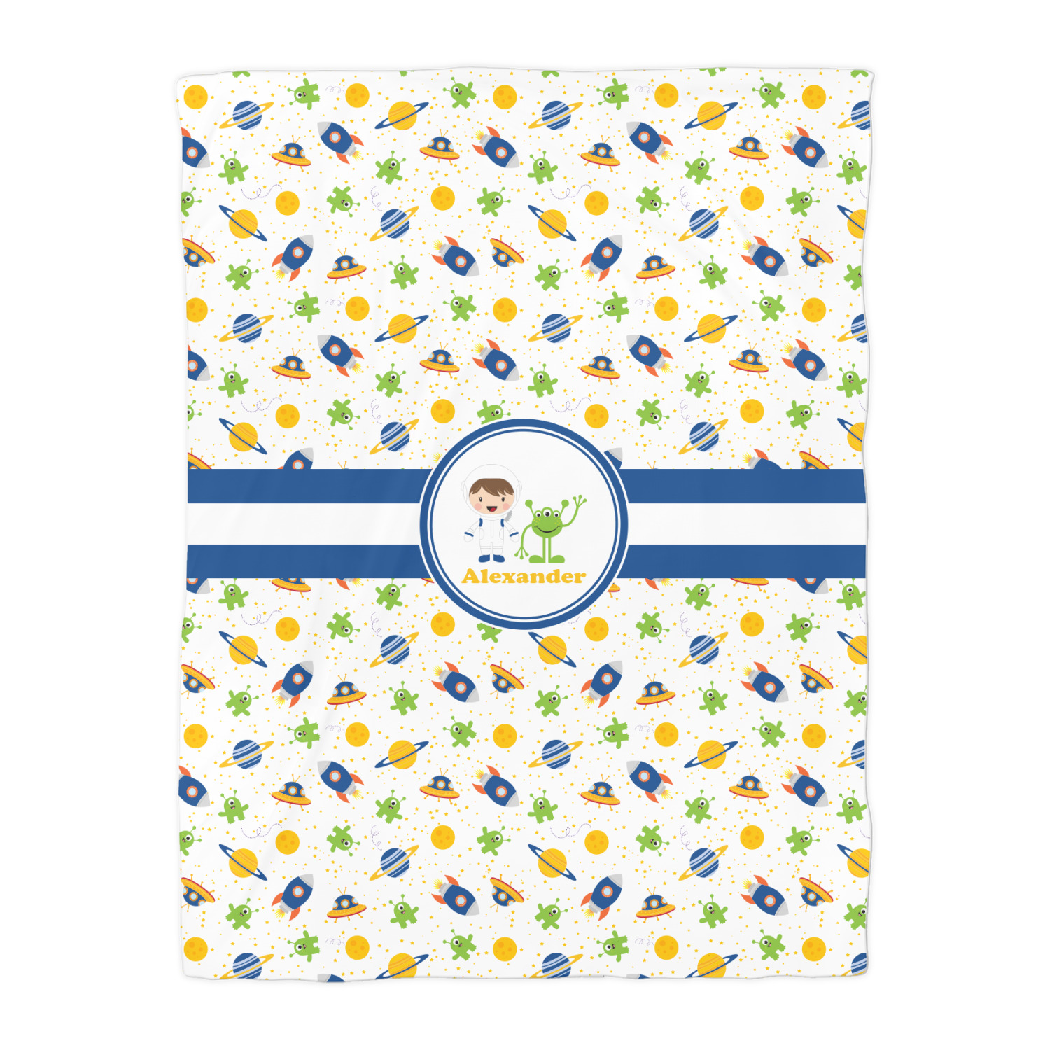 A blue and white band is placed in the middle of the design and used to showcase your little space traveler and his martian buddy. Add your own personalization for that special touch.