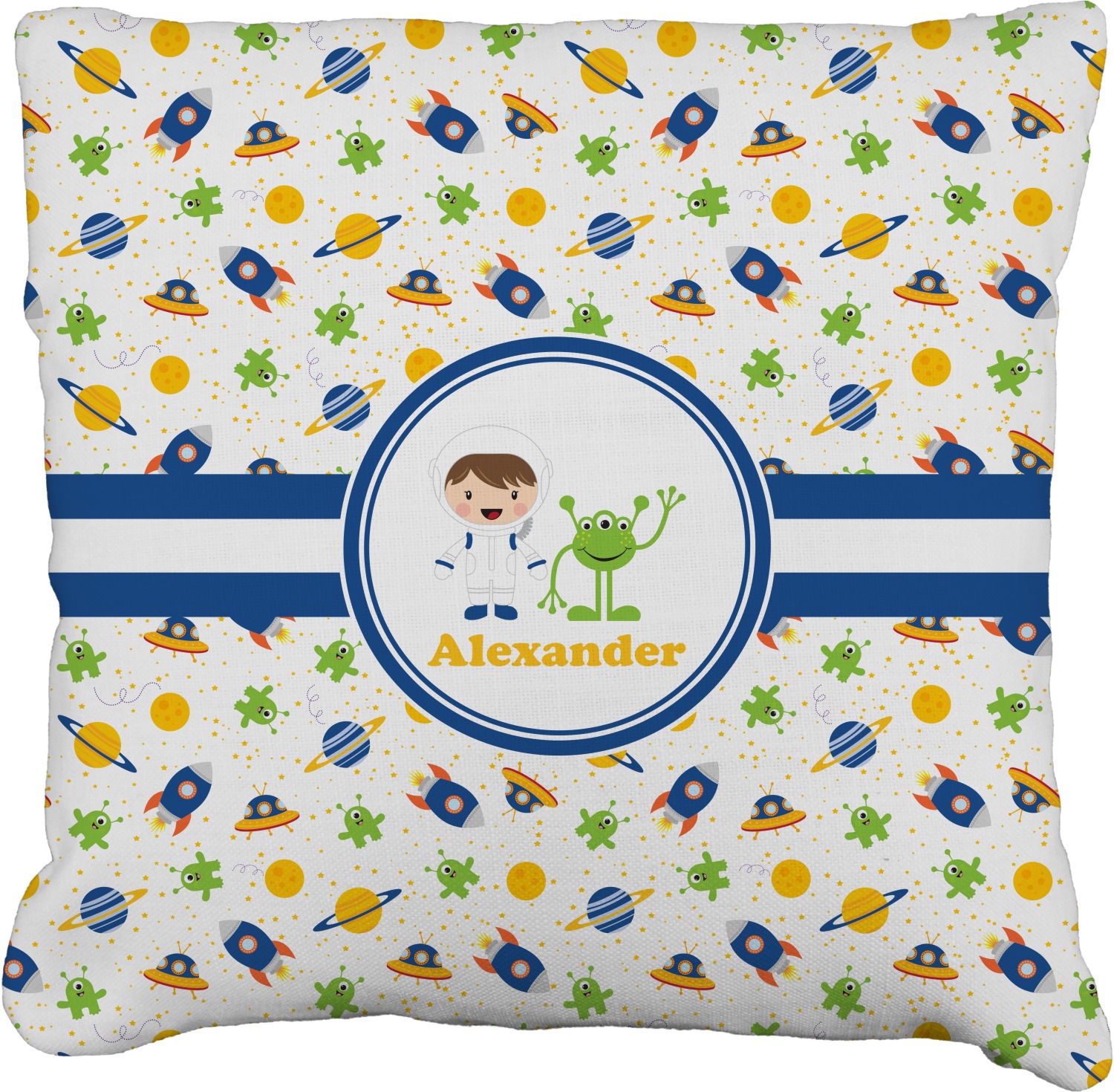 A blue and white band is placed in the middle of the design and used to showcase your little space traveler and his martian buddy. Add your own personalization for that special touch.
