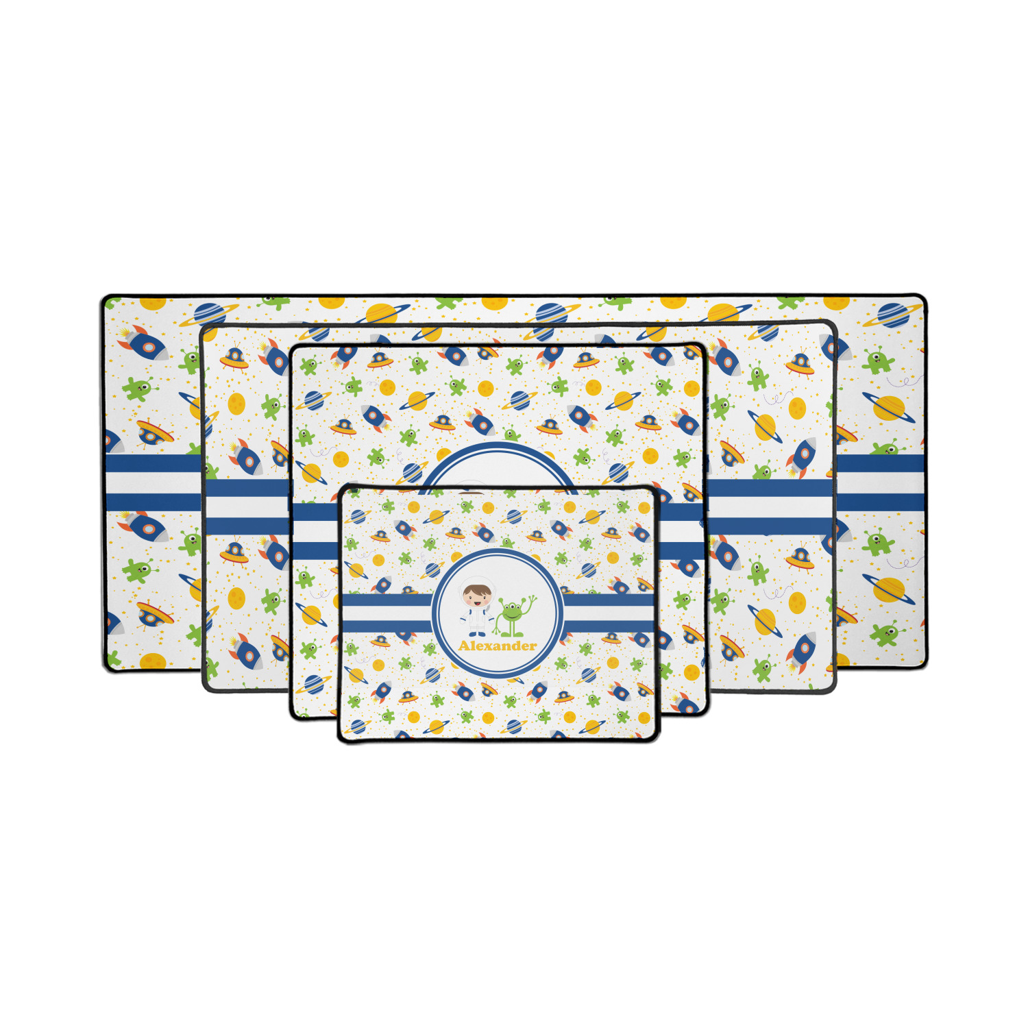 A blue and white band is placed in the middle of the design and used to showcase your little space traveler and his martian buddy. Add your own personalization for that special touch.
