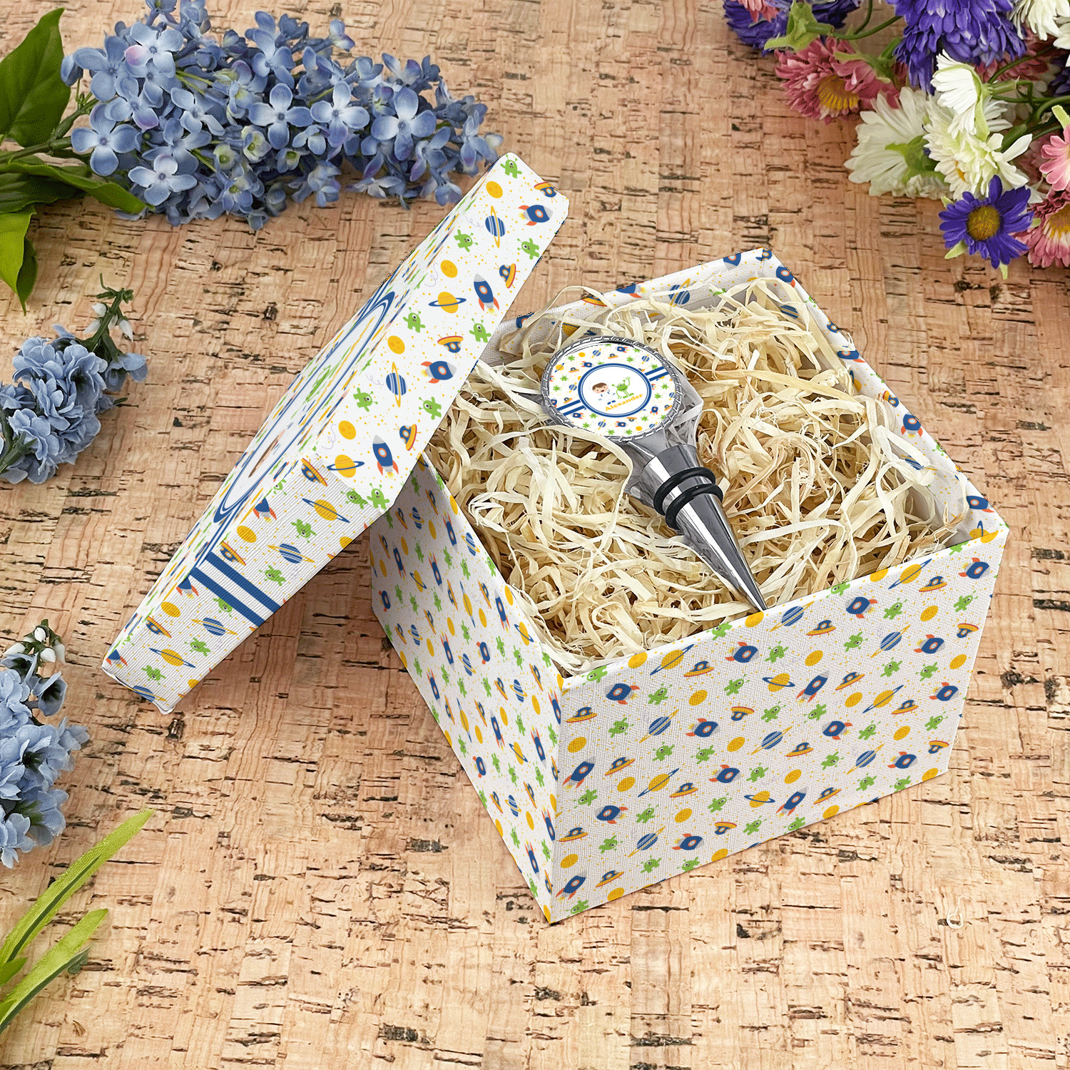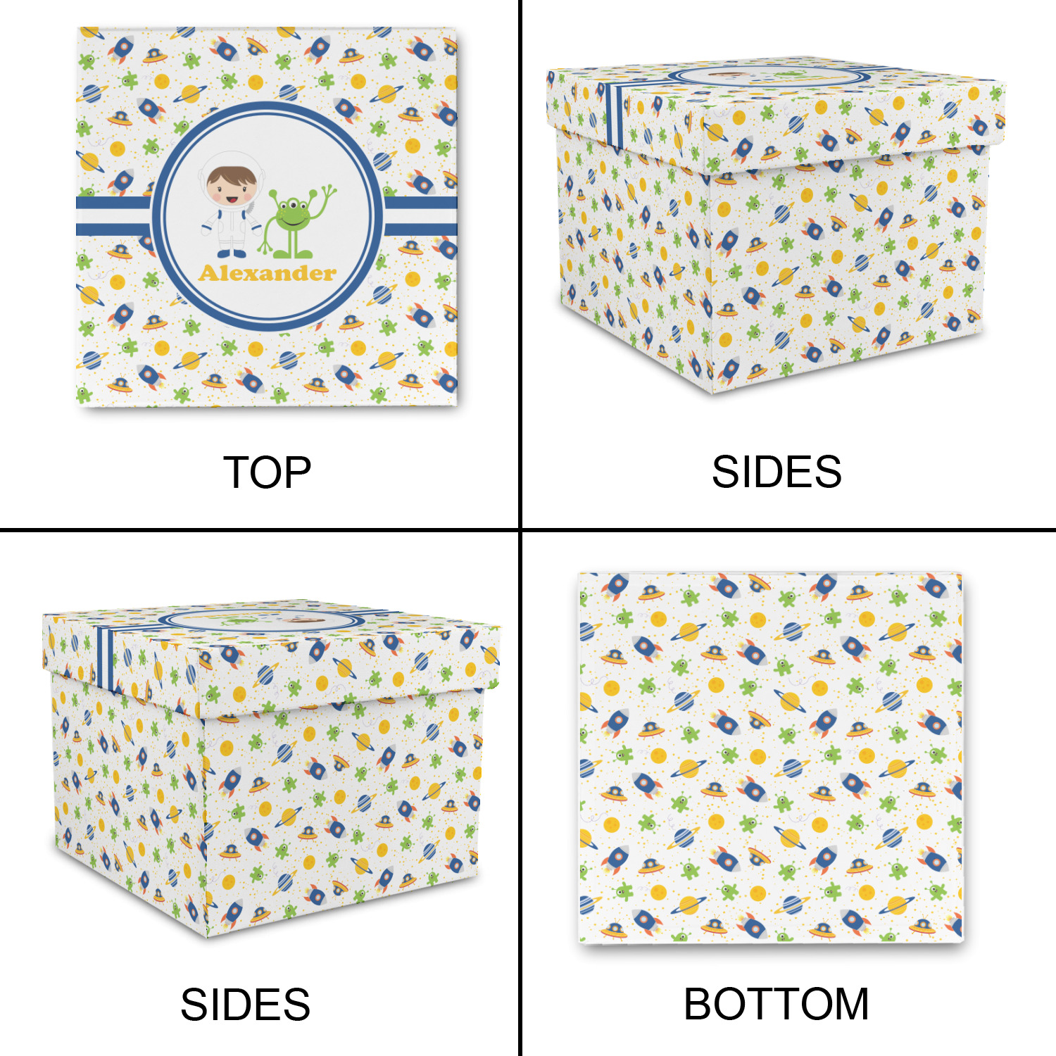 A blue and white band is placed in the middle of the design and used to showcase your little space traveler and his martian buddy. Add your own personalization for that special touch.
