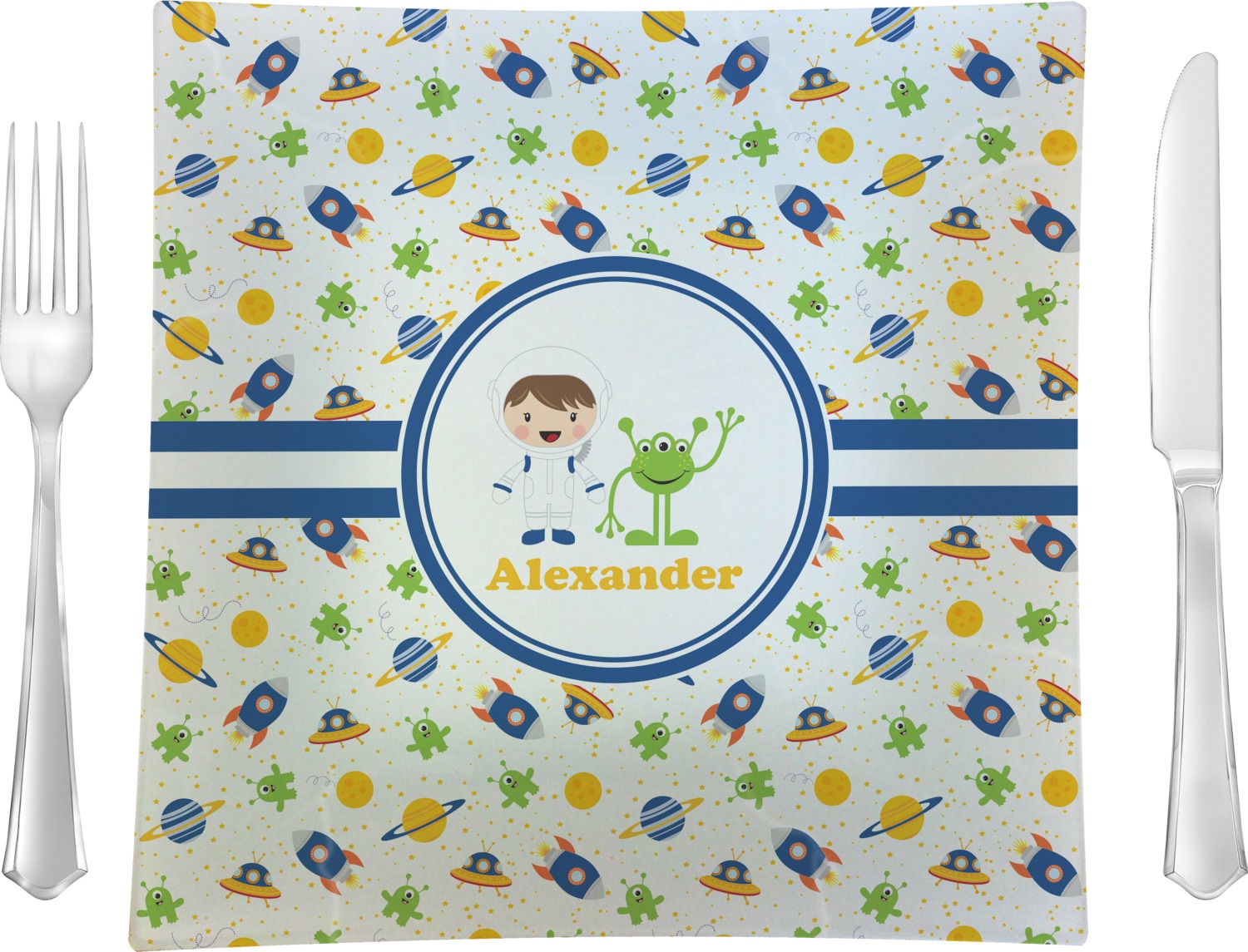 A blue and white band is placed in the middle of the design and used to showcase your little space traveler and his martian buddy. Add your own personalization for that special touch.