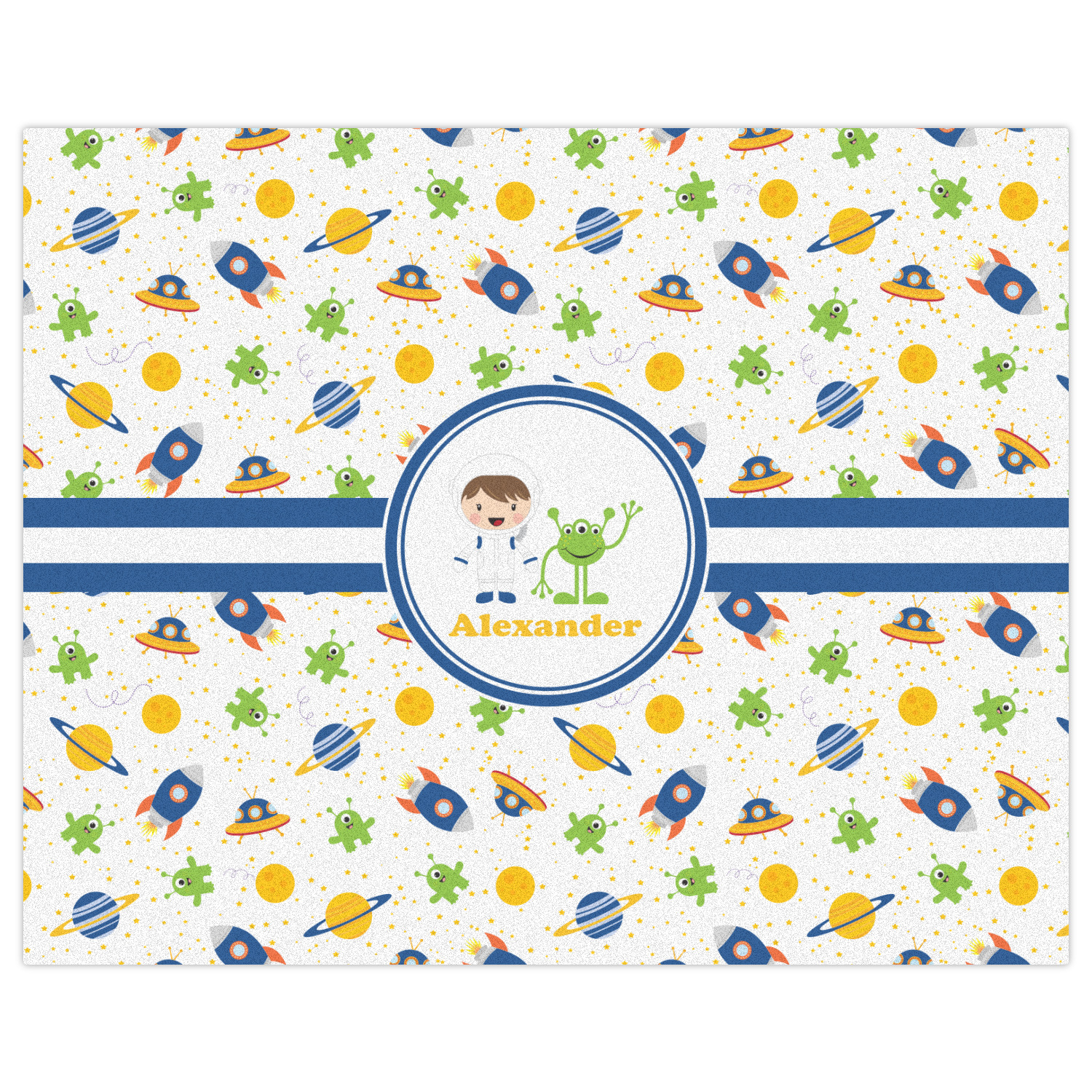 A blue and white band is placed in the middle of the design and used to showcase your little space traveler and his martian buddy. Add your own personalization for that special touch.