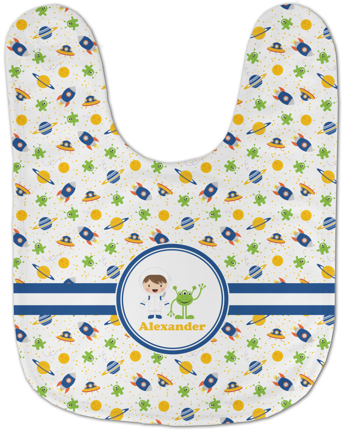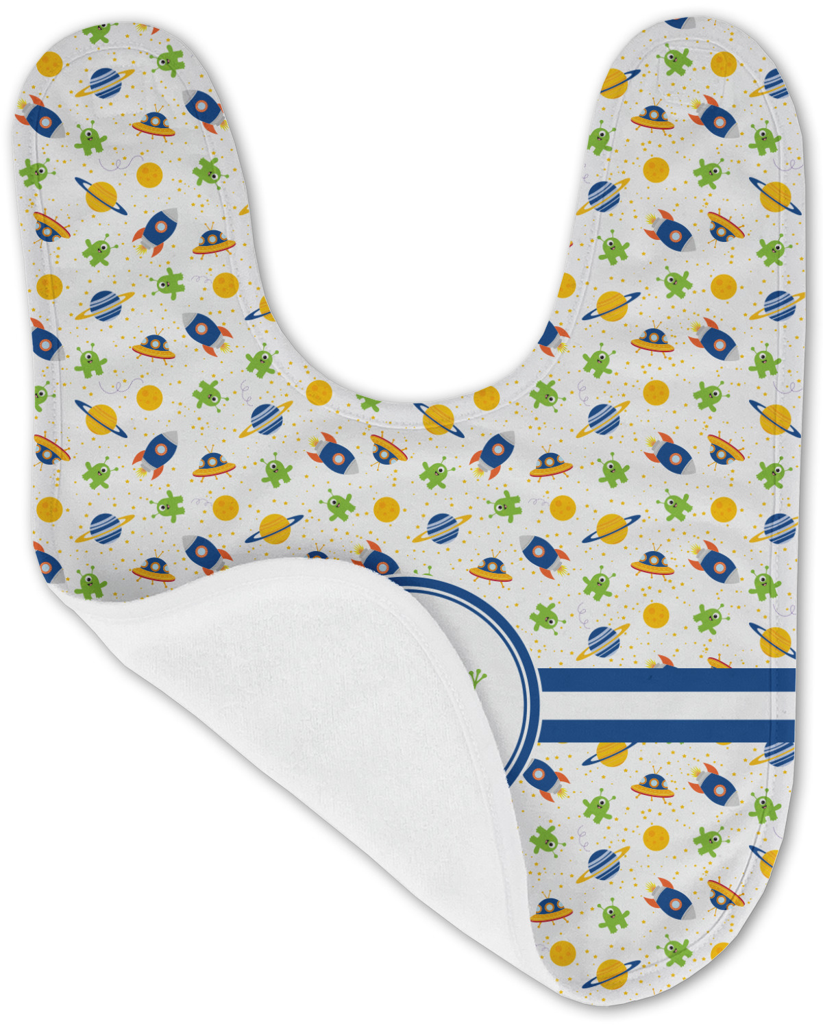 Made of soft polyester, each customizable bib hugs comfortably around the neck to catch every drip and drool. Each bib design is printed with baby-safe ink and finished with a secure stitch pattern and velcro clasp. We carry two customizable bib styles -Microfiber Velour and Jersey Knit.