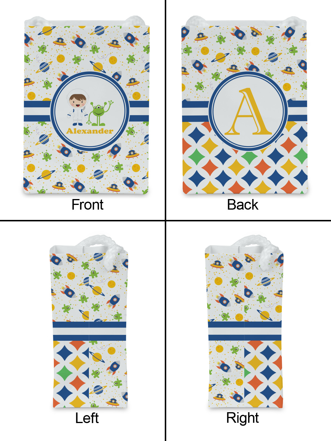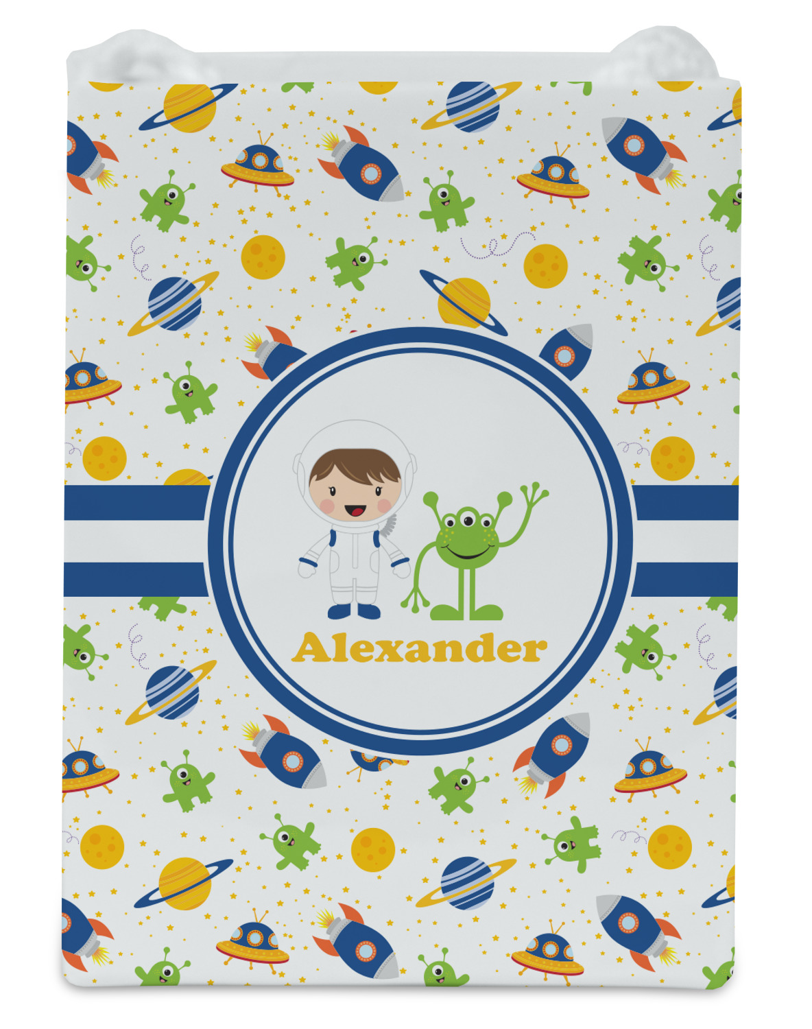 A blue and white band is placed in the middle of the design and used to showcase your little space traveler and his martian buddy. Add your own personalization for that special touch.