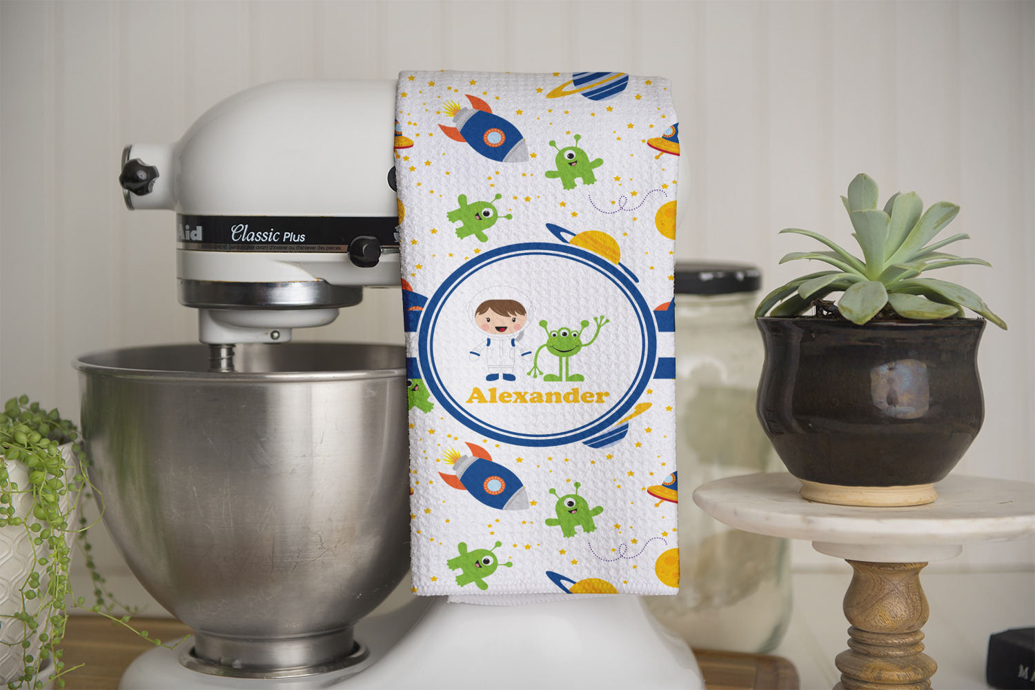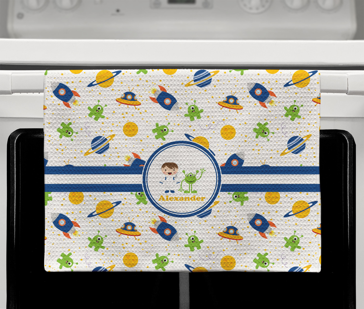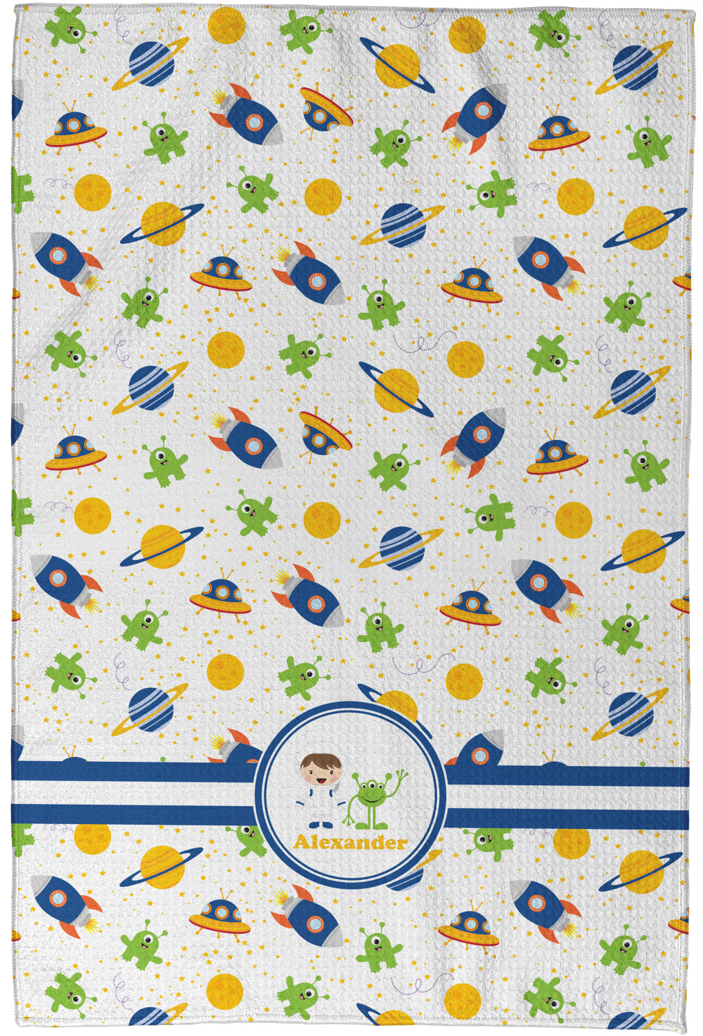 A blue and white band is placed in the middle of the design and used to showcase your little space traveler and his martian buddy. Add your own personalization for that special touch.