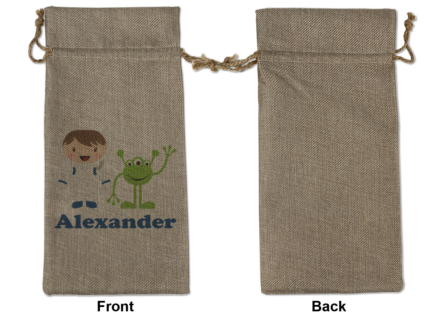 We sell our Burlap Gift Bags in 3 variant sized bags. Made with burlap polyester, each personalized bag can be secured with a twine drawstring pull. Your custom design is available to print on one side or both sides - completely up to you! The sizes of the bags measure approximately 4.5" x 6.5" for the smallest size, 6.5" x 8.0" for the medium size, and 6.5" x 13.5" for the large-sized bag.