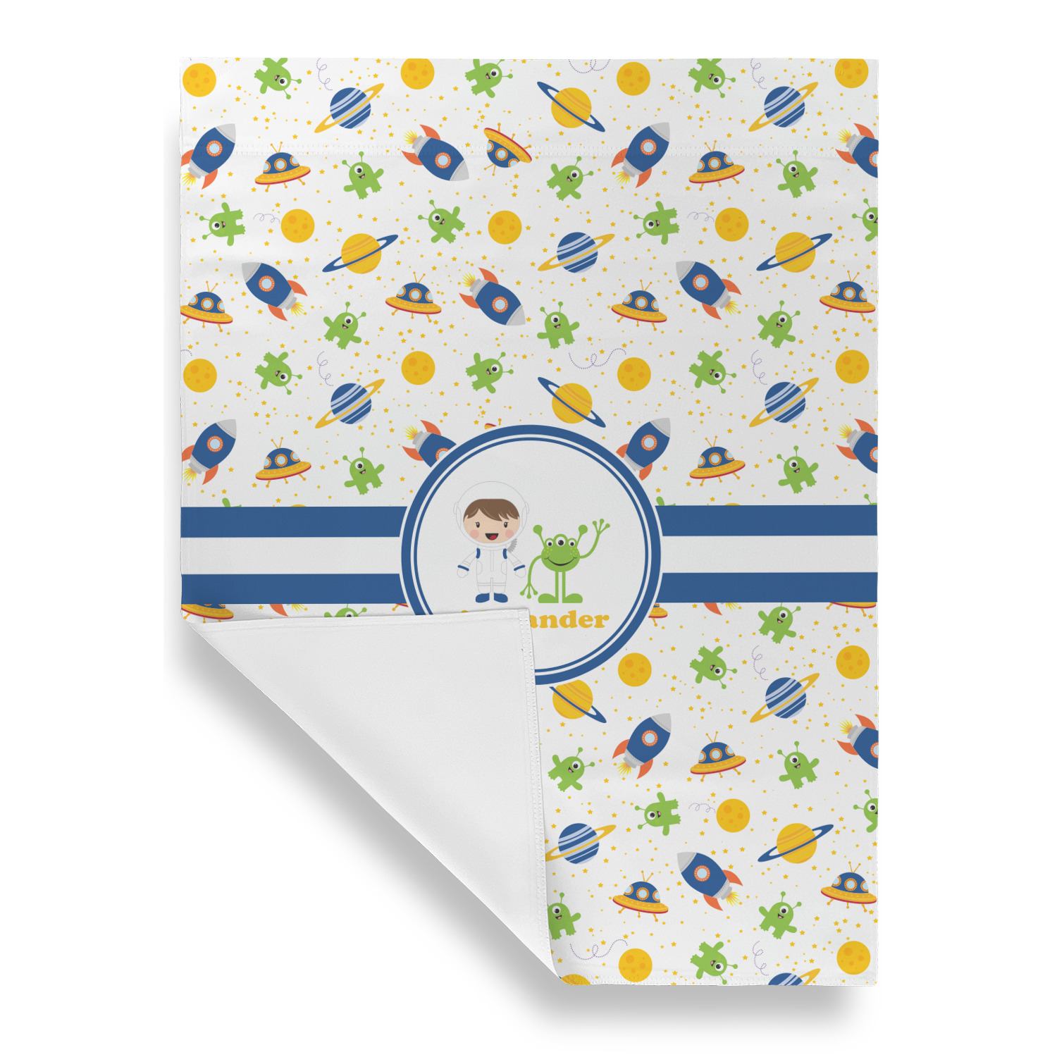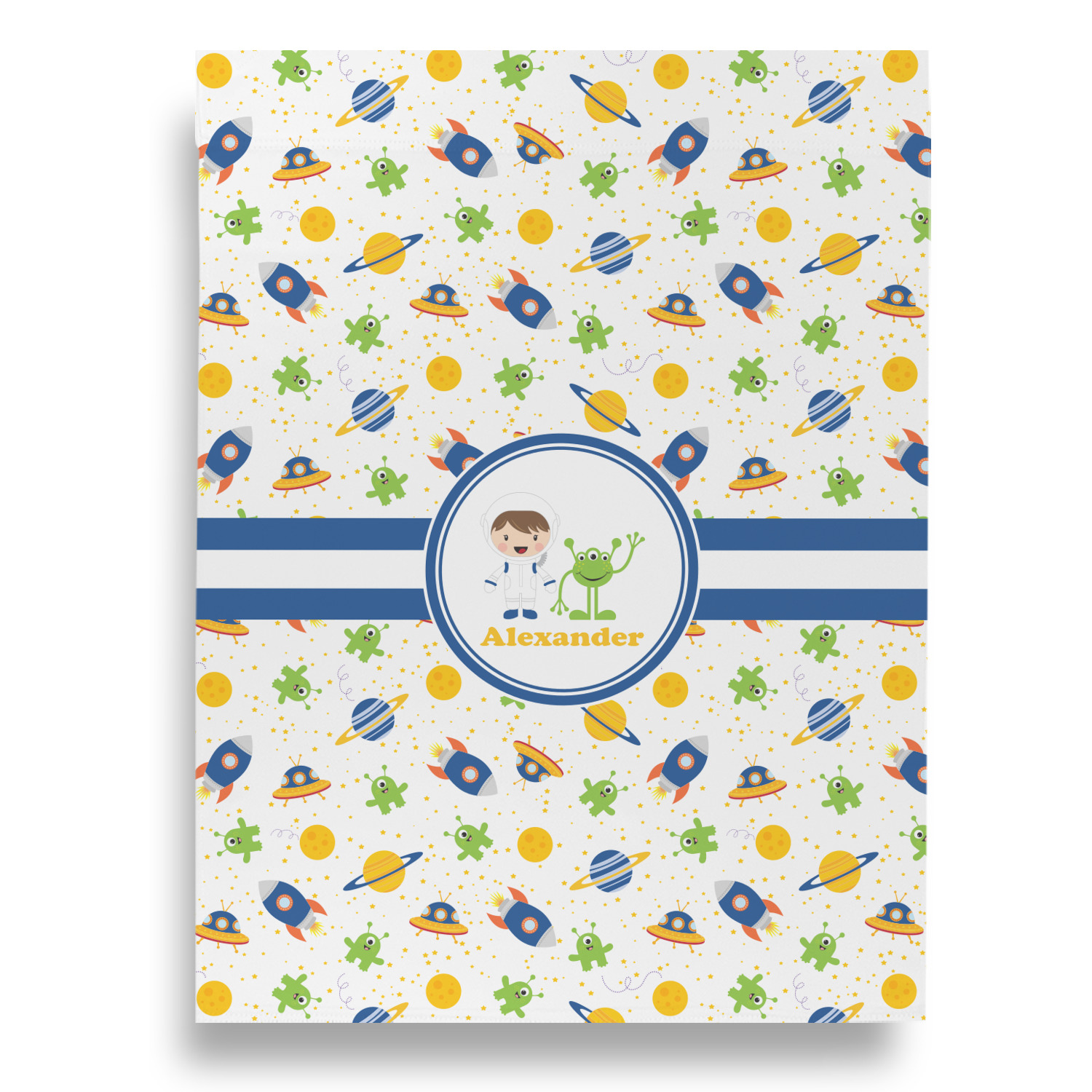 A blue and white band is placed in the middle of the design and used to showcase your little space traveler and his martian buddy. Add your own personalization for that special touch.