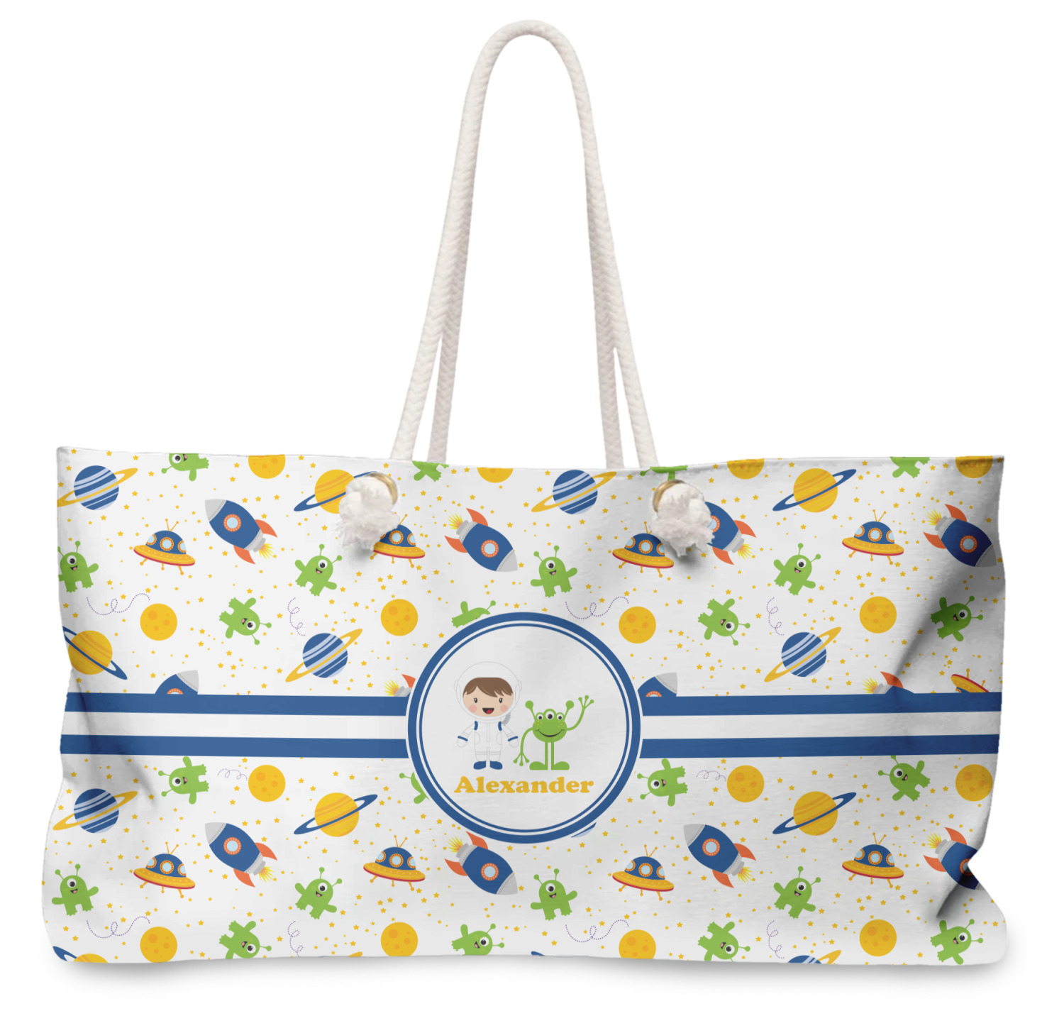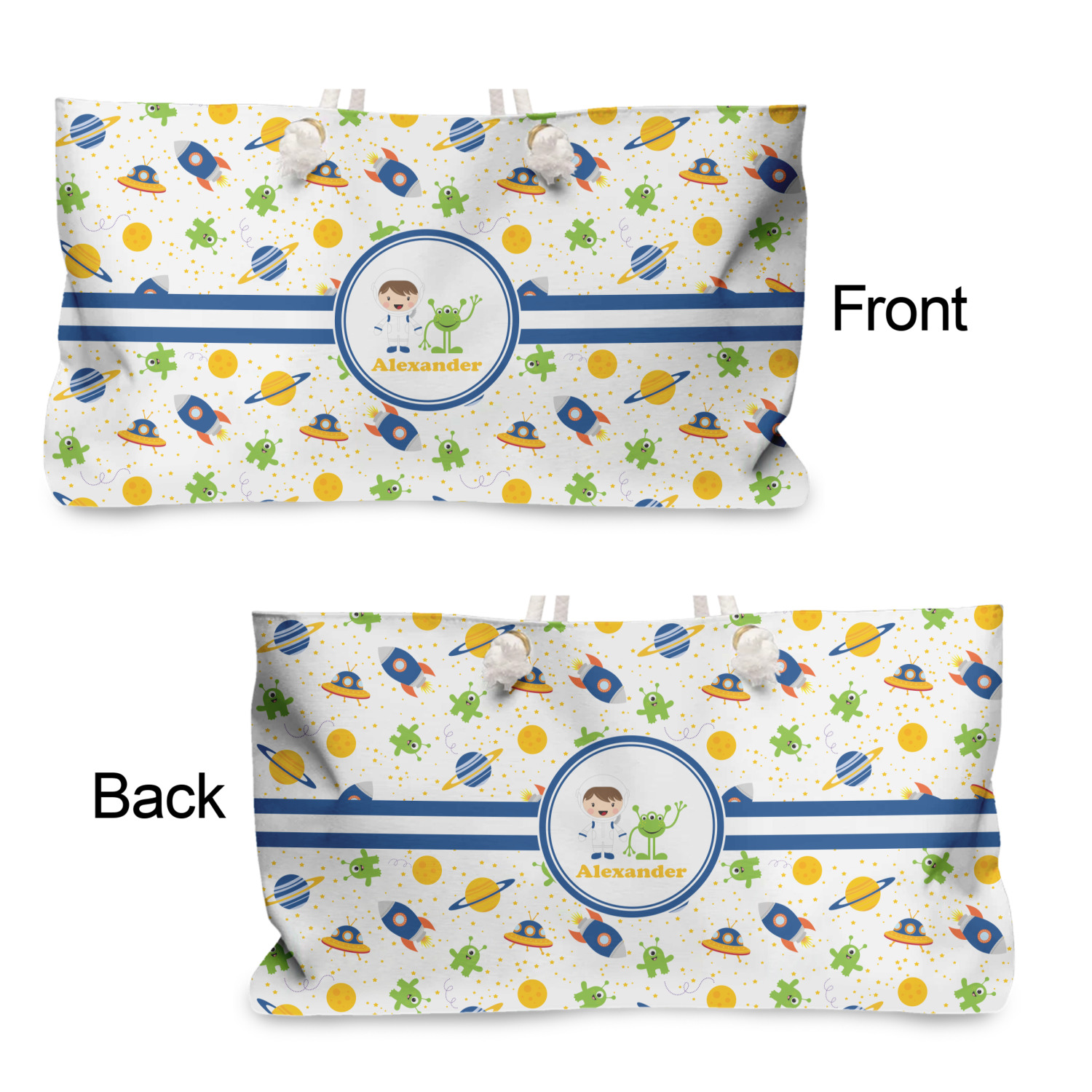 A blue and white band is placed in the middle of the design and used to showcase your little space traveler and his martian buddy. Add your own personalization for that special touch.