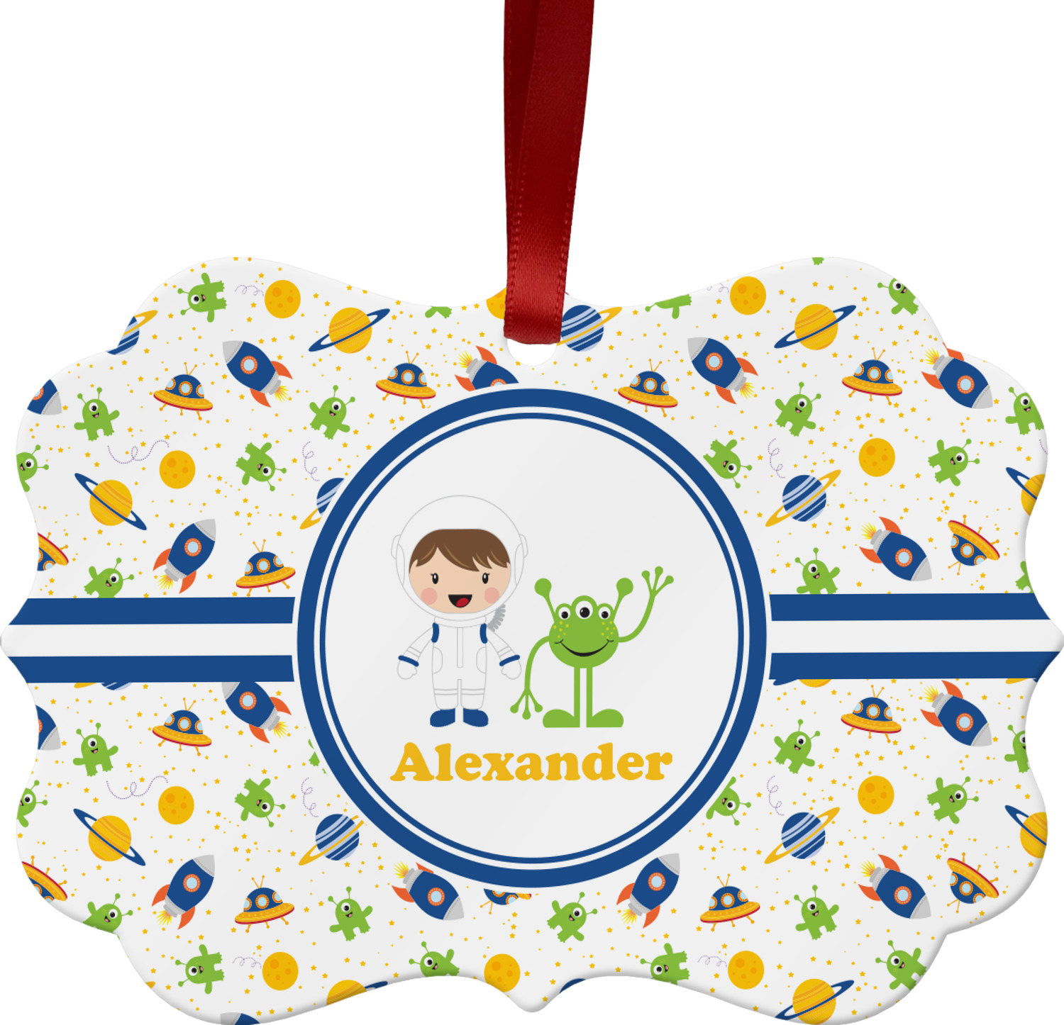 A blue and white band is placed in the middle of the design and used to showcase your little space traveler and his martian buddy. Add your own personalization for that special touch.