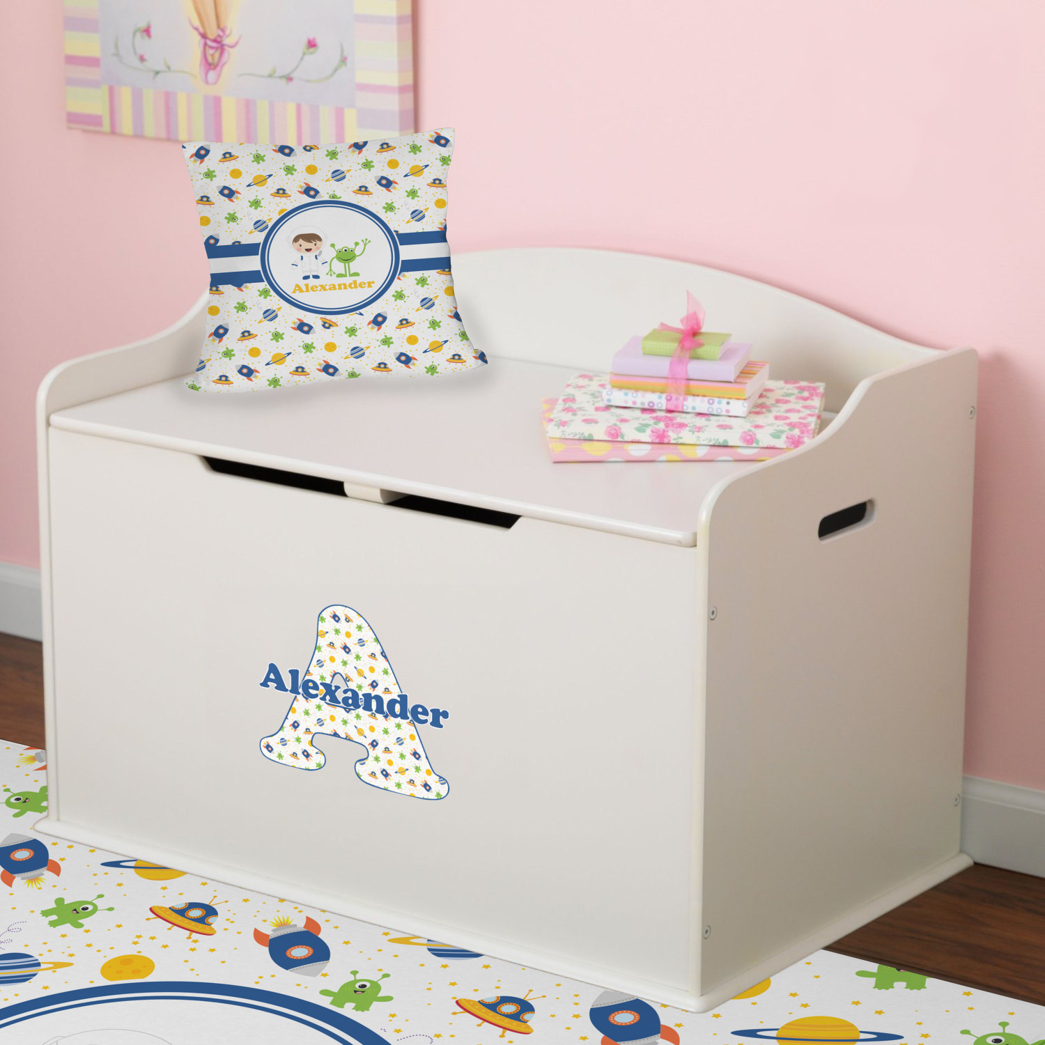 A blue and white band is placed in the middle of the design and used to showcase your little space traveler and his martian buddy. Add your own personalization for that special touch.