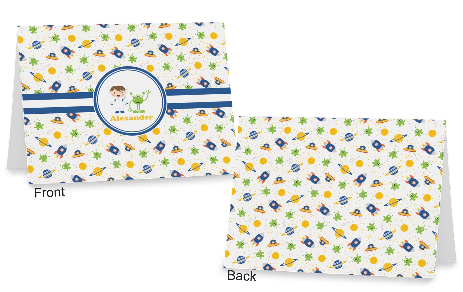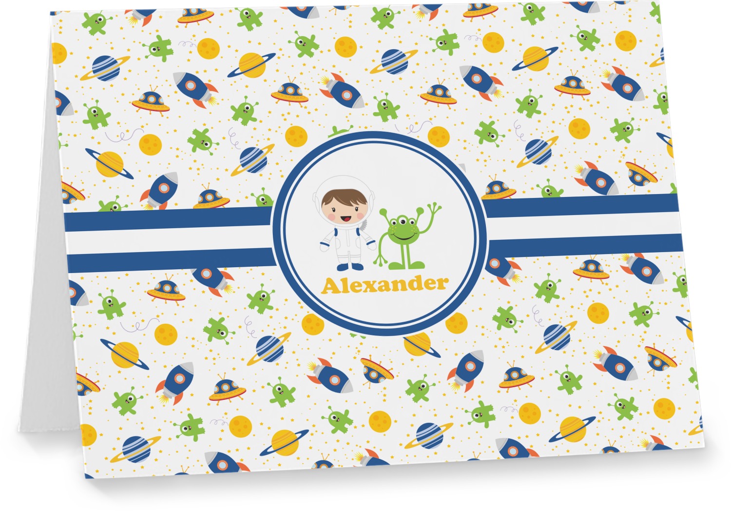 A blue and white band is placed in the middle of the design and used to showcase your little space traveler and his martian buddy. Add your own personalization for that special touch.