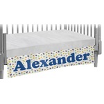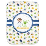 A blue and white band is placed in the middle of the design and used to showcase your little space traveler and his martian buddy. Add your own personalization for that special touch.