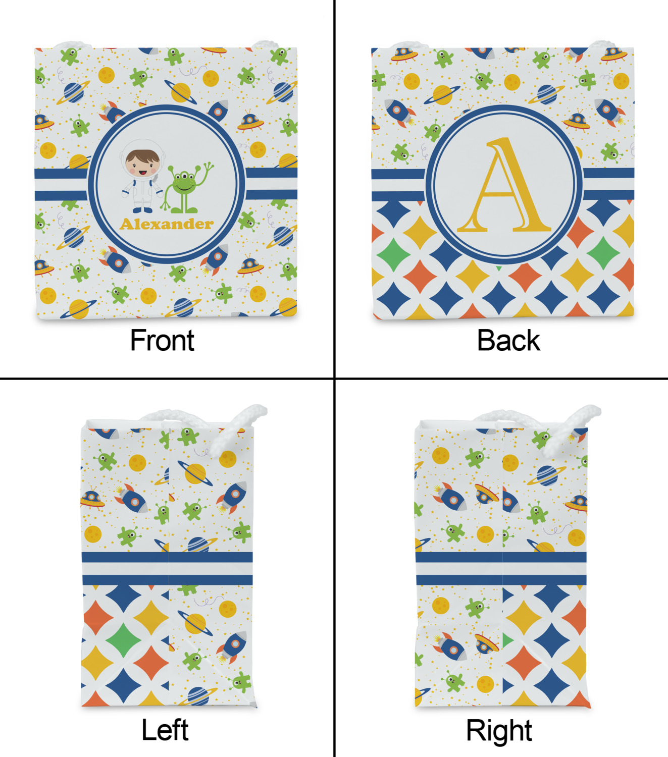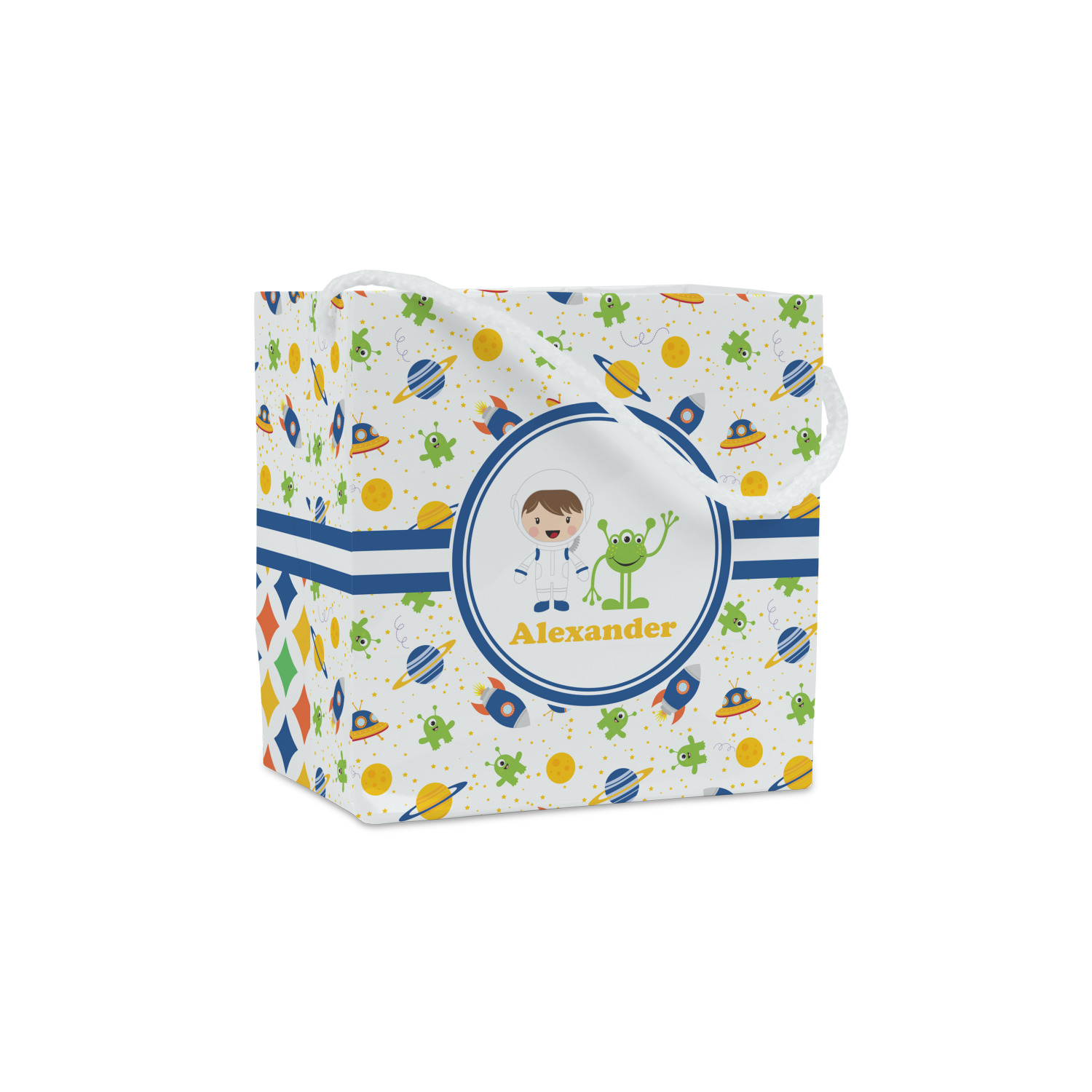 A blue and white band is placed in the middle of the design and used to showcase your little space traveler and his martian buddy. Add your own personalization for that special touch.