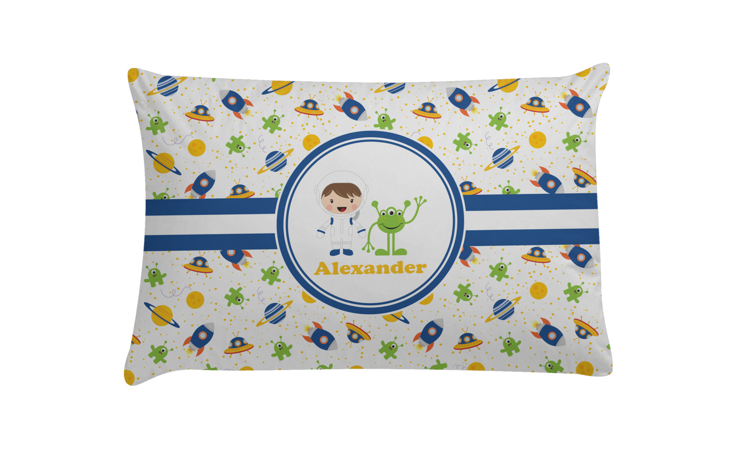 A blue and white band is placed in the middle of the design and used to showcase your little space traveler and his martian buddy. Add your own personalization for that special touch.