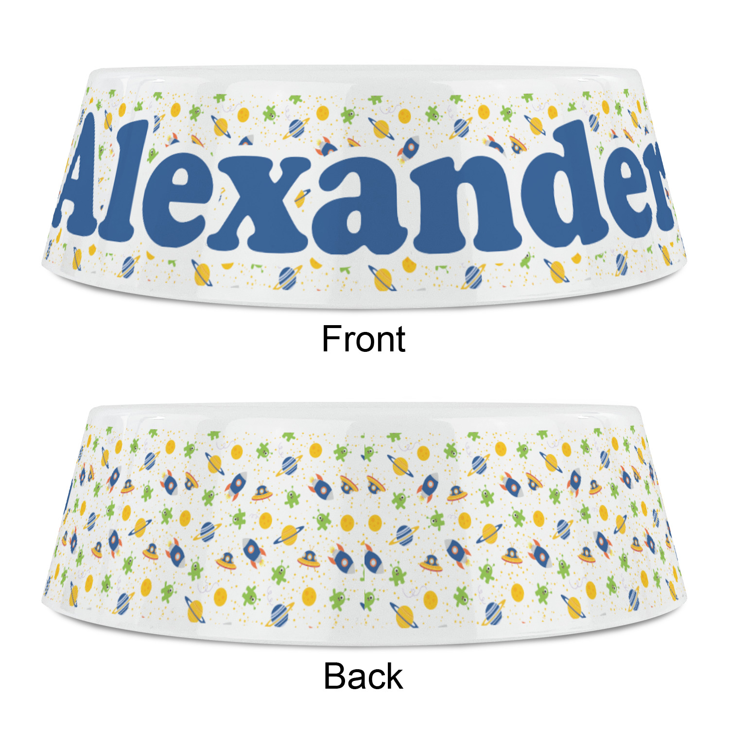 A blue and white band is placed in the middle of the design and used to showcase your little space traveler and his martian buddy. Add your own personalization for that special touch.
