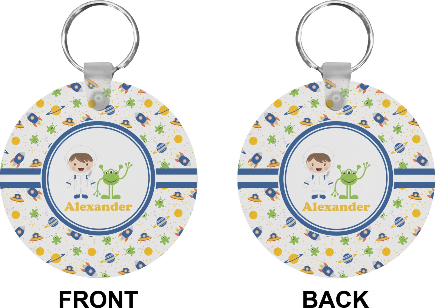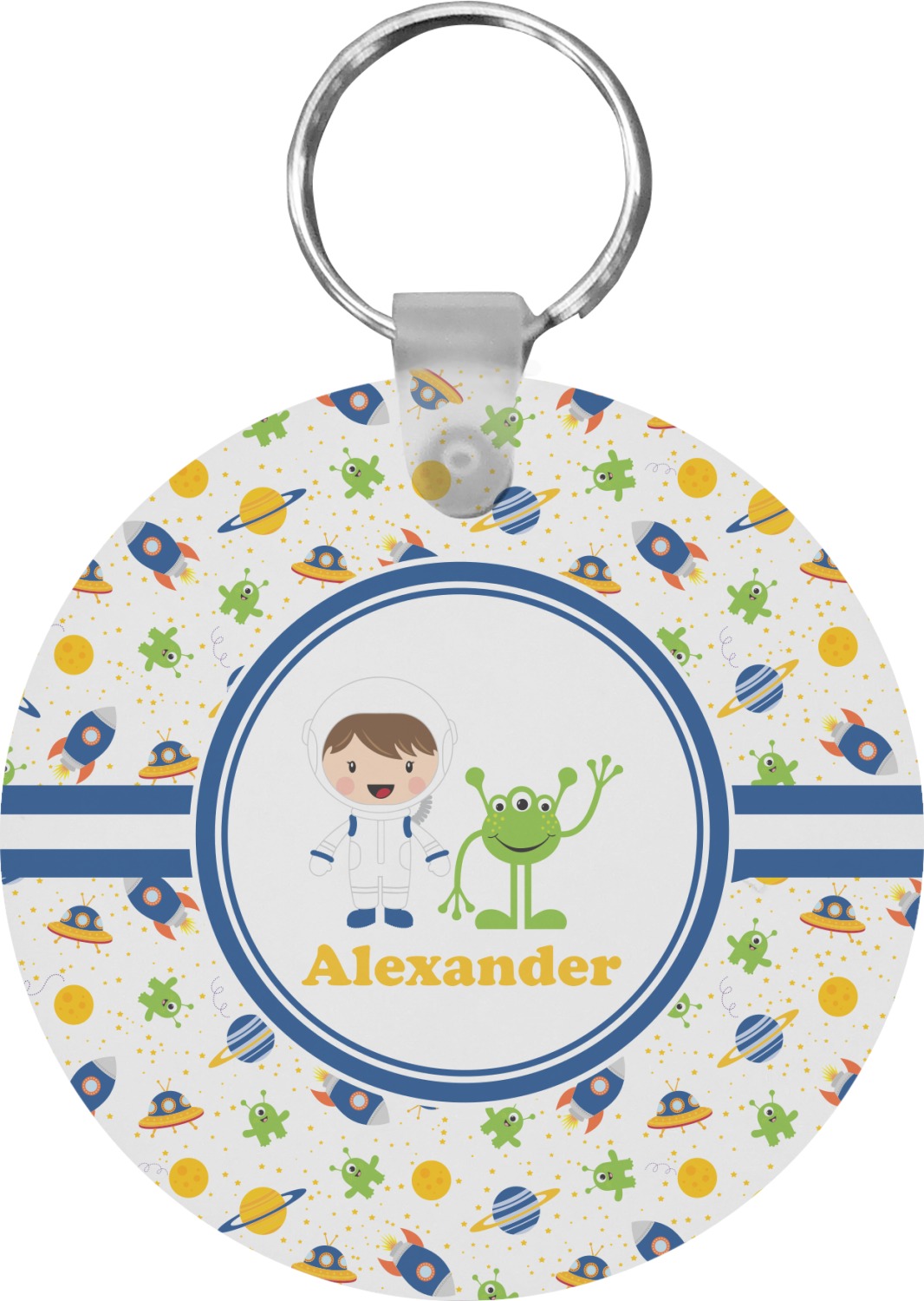 A blue and white band is placed in the middle of the design and used to showcase your little space traveler and his martian buddy. Add your own personalization for that special touch.