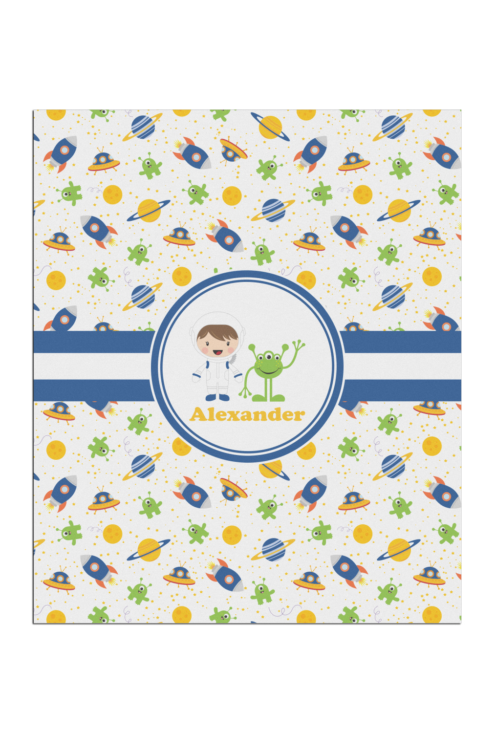A blue and white band is placed in the middle of the design and used to showcase your little space traveler and his martian buddy. Add your own personalization for that special touch.