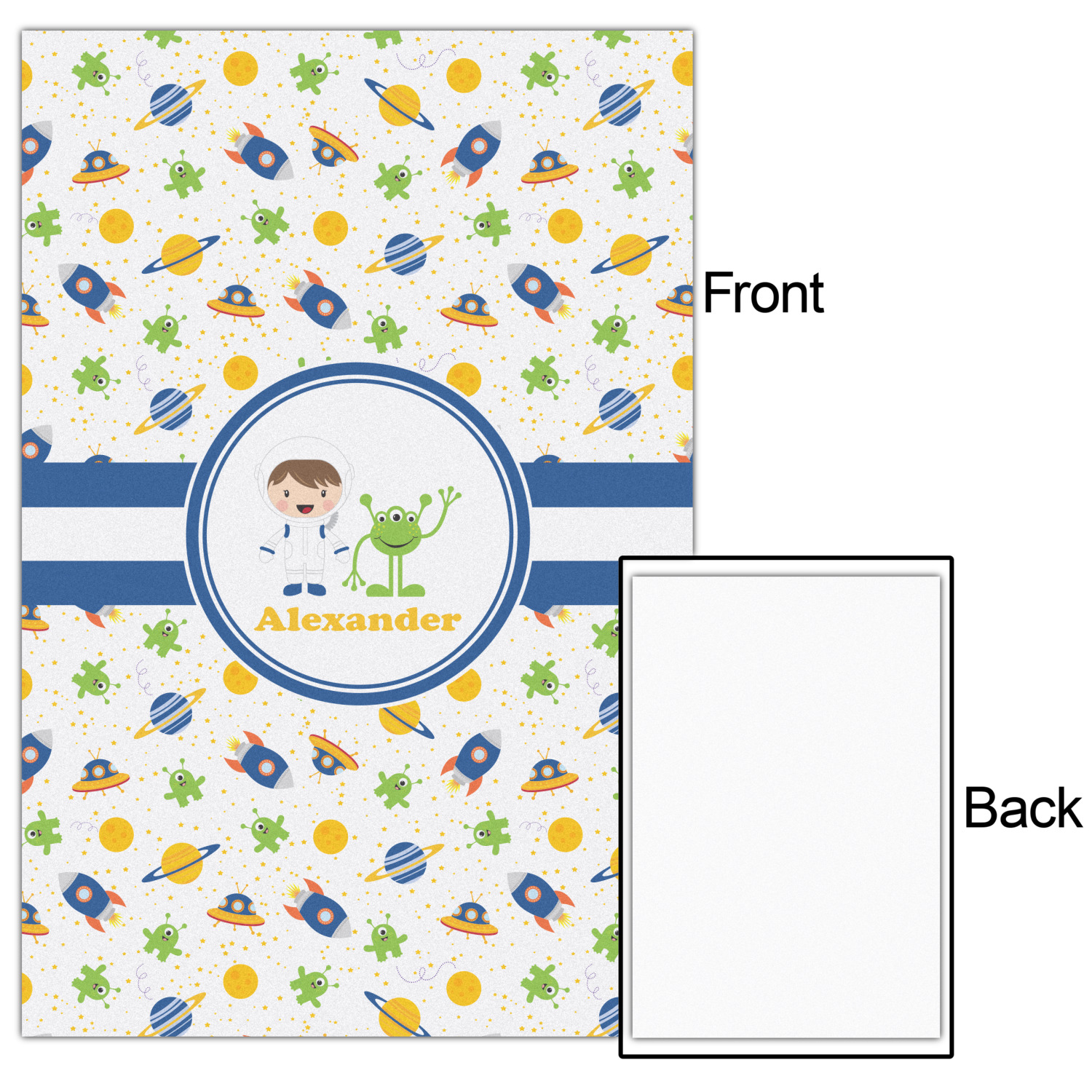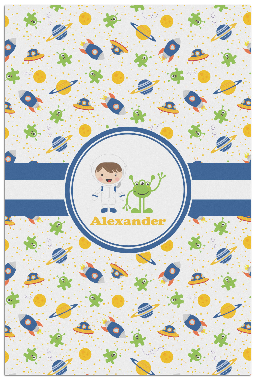 A blue and white band is placed in the middle of the design and used to showcase your little space traveler and his martian buddy. Add your own personalization for that special touch.
