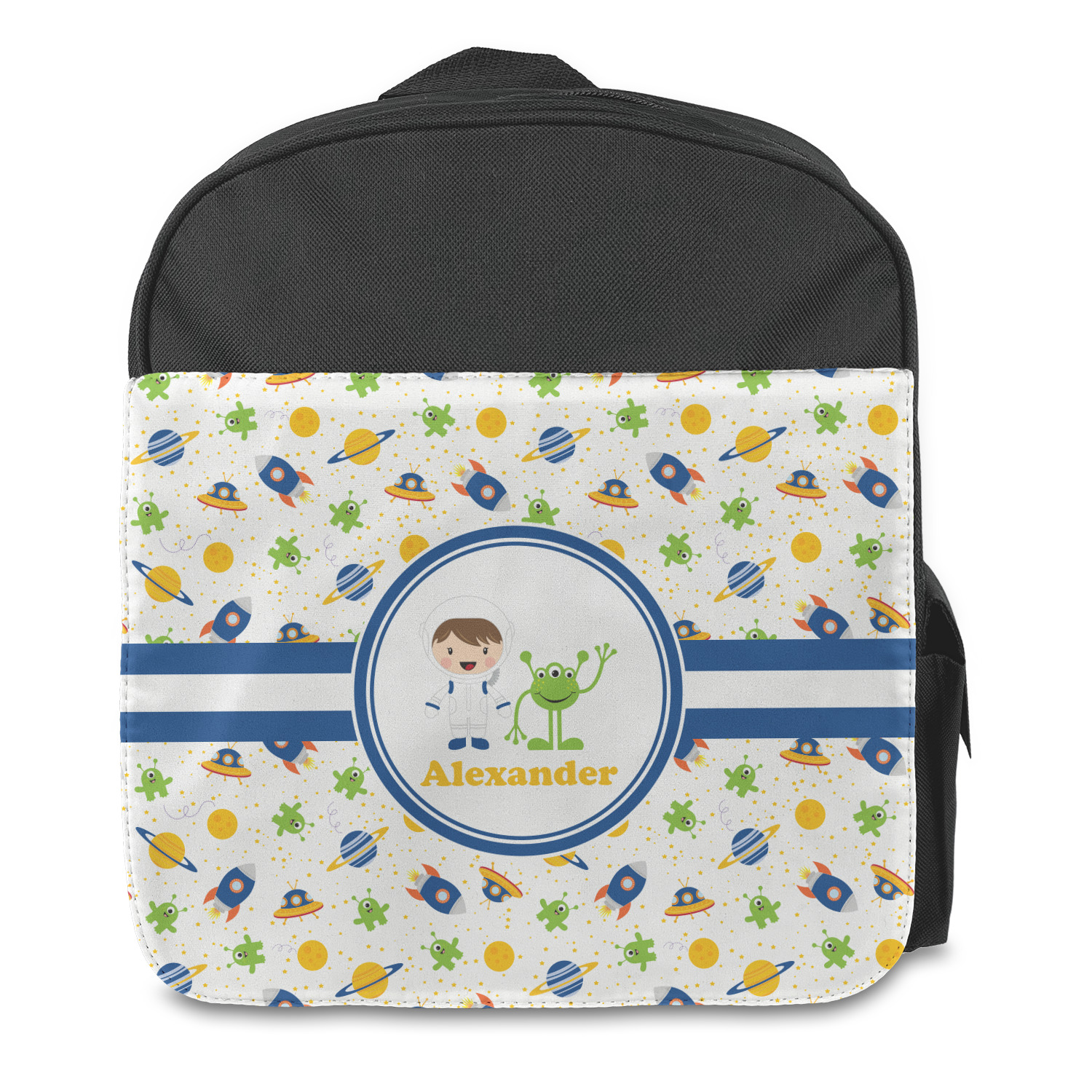 A blue and white band is placed in the middle of the design and used to showcase your little space traveler and his martian buddy. Add your own personalization for that special touch.