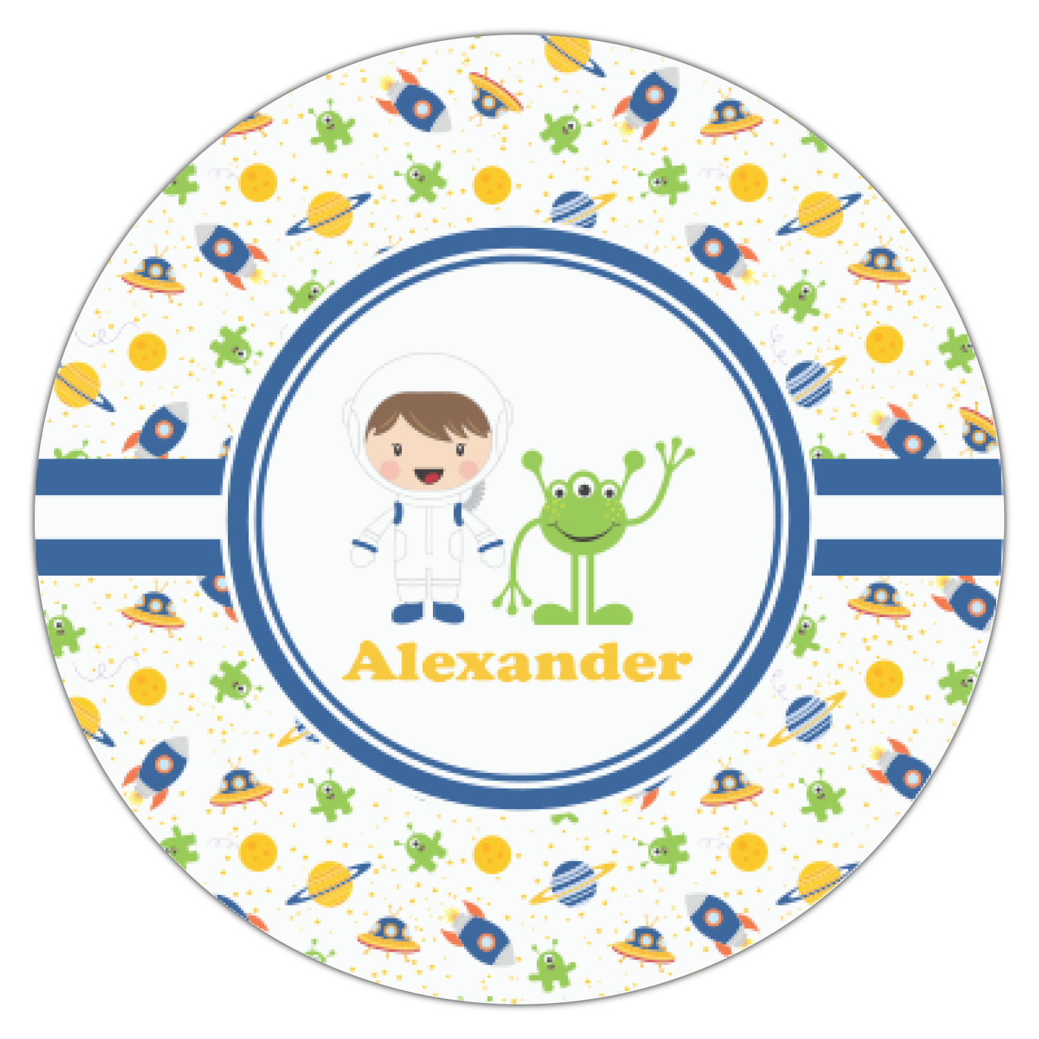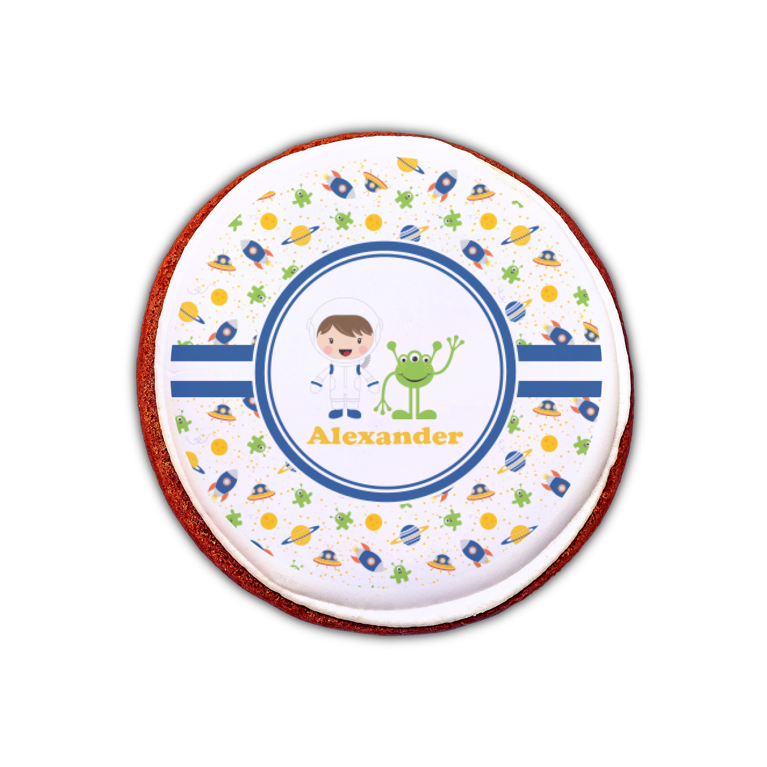 A blue and white band is placed in the middle of the design and used to showcase your little space traveler and his martian buddy. Add your own personalization for that special touch.