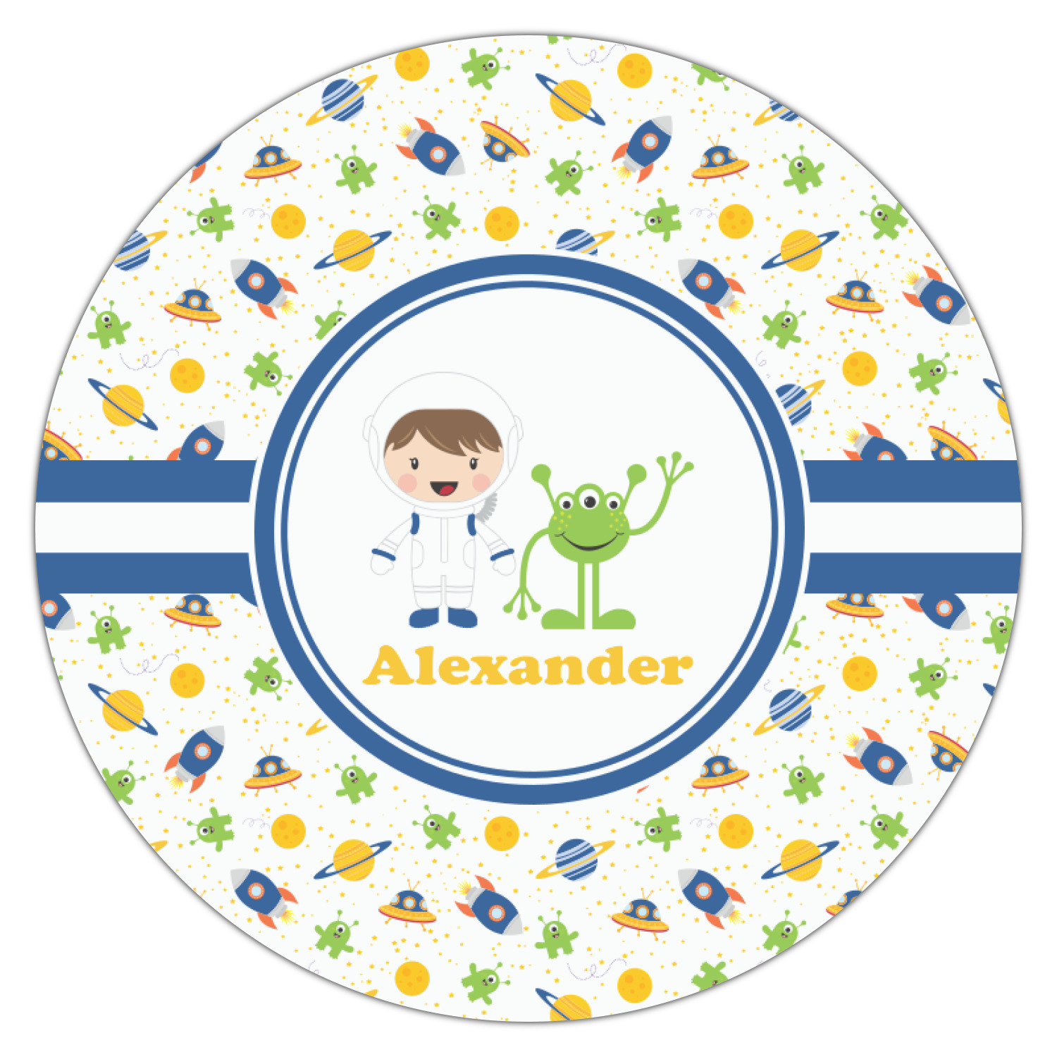 A blue and white band is placed in the middle of the design and used to showcase your little space traveler and his martian buddy. Add your own personalization for that special touch.