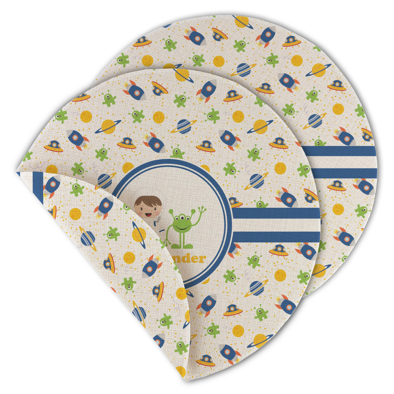 A blue and white band is placed in the middle of the design and used to showcase your little space traveler and his martian buddy. Add your own personalization for that special touch.