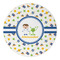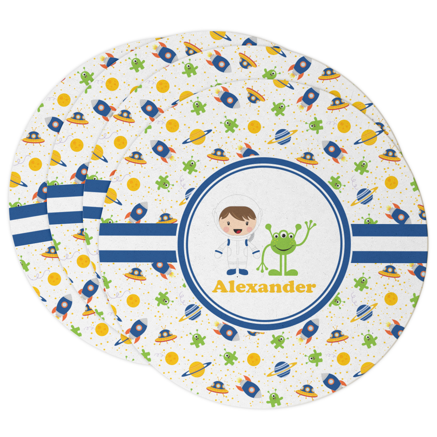 A blue and white band is placed in the middle of the design and used to showcase your little space traveler and his martian buddy. Add your own personalization for that special touch.