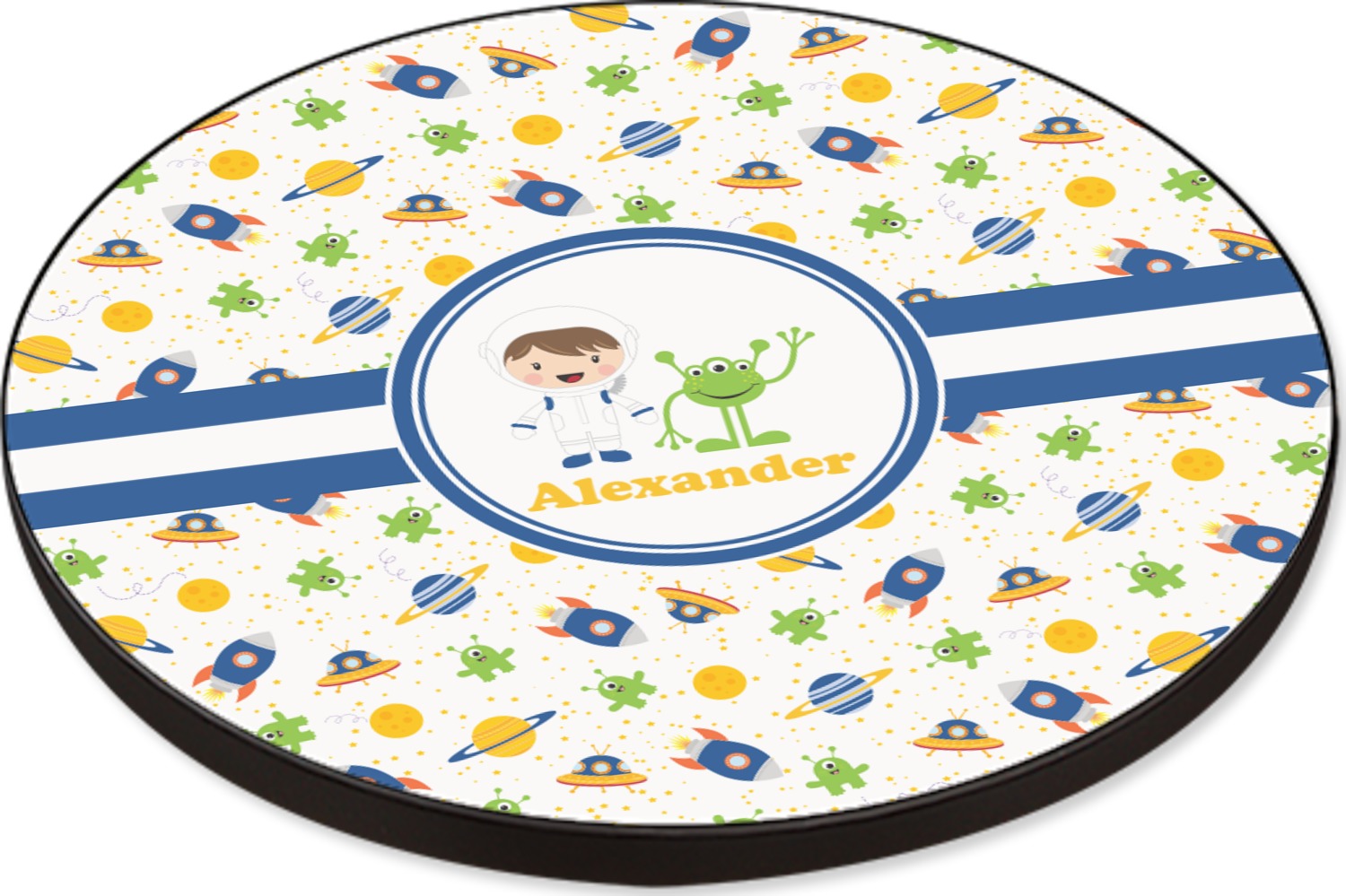 A blue and white band is placed in the middle of the design and used to showcase your little space traveler and his martian buddy. Add your own personalization for that special touch.