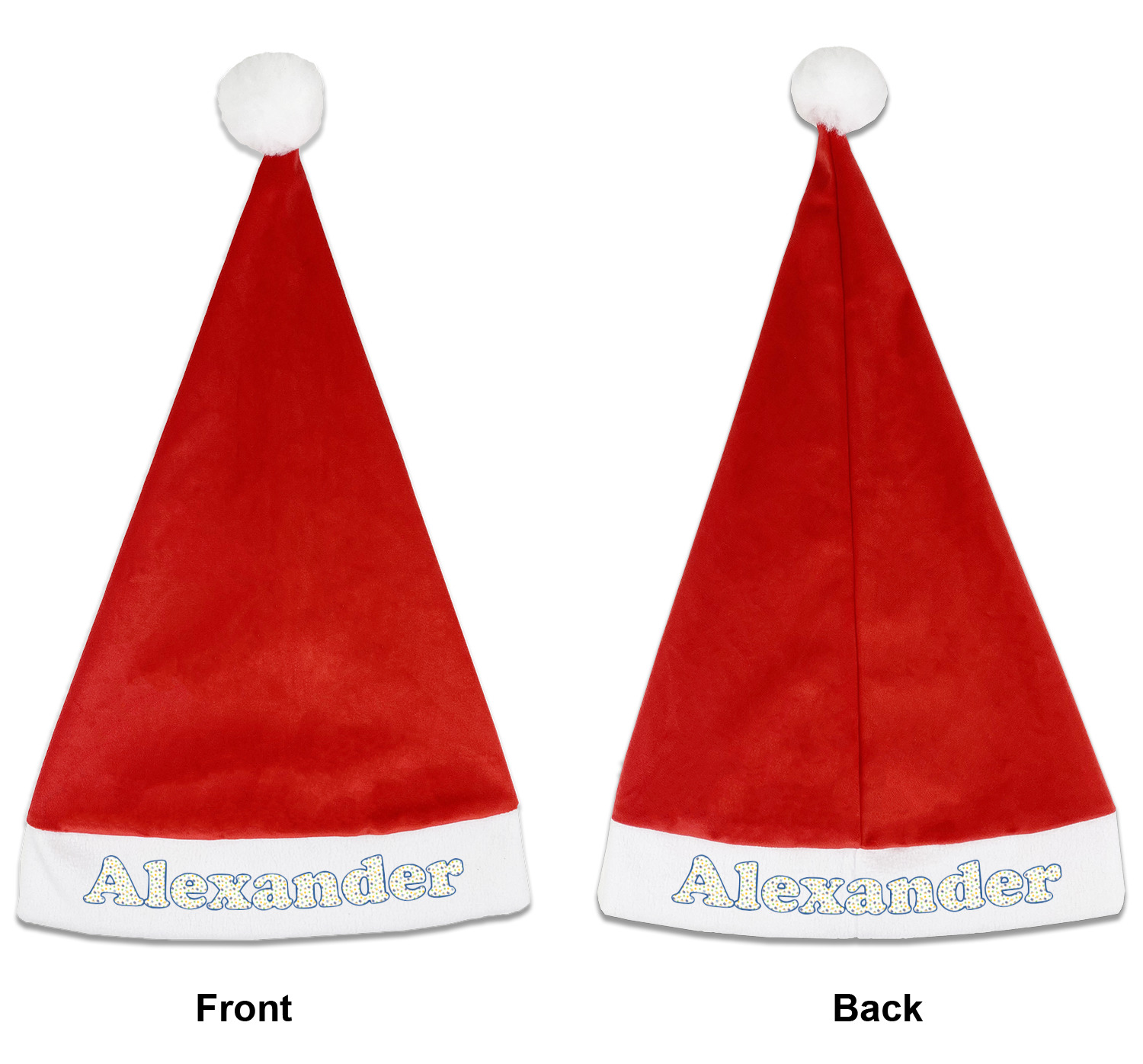 Our Santa hats are a soft, velvety polyester material. These customizable Santa hats are a classic red with white brimming and pom pom ball hanging off the hat tail just like Santa Claus! Each personalized Santa hat is approximately 17.5 L x 11.8 W. We offer two different styles to print your designs on the white brim - front or front & back.