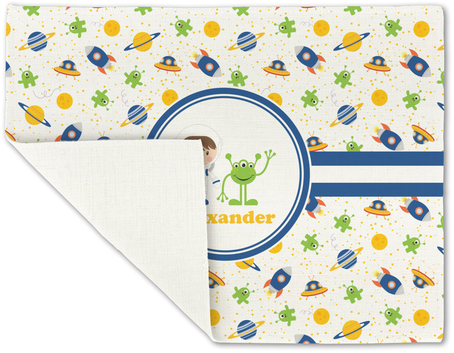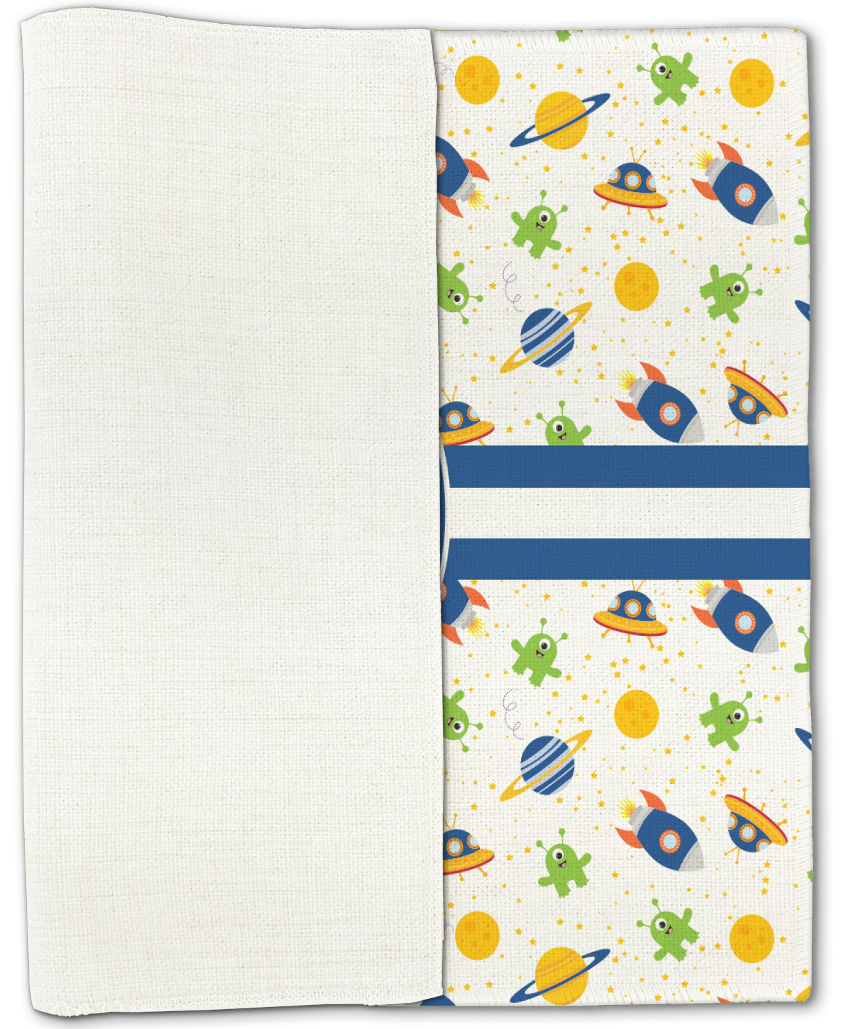 A blue and white band is placed in the middle of the design and used to showcase your little space traveler and his martian buddy. Add your own personalization for that special touch.