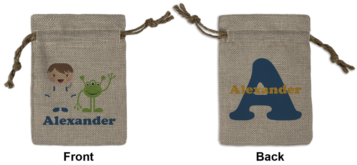 We sell our Burlap Gift Bags in 3 variant sized bags. Made with burlap polyester, each personalized bag can be secured with a twine drawstring pull. Your custom design is available to print on one side or both sides - completely up to you! The sizes of the bags measure approximately 4.5" x 6.5" for the smallest size, 6.5" x 8.0" for the medium size, and 6.5" x 13.5" for the large-sized bag.