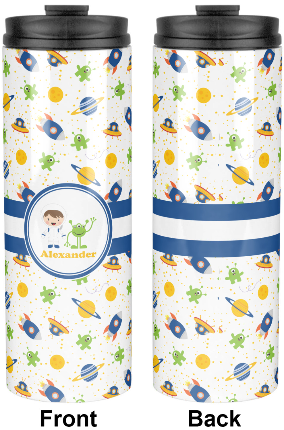 A blue and white band is placed in the middle of the design and used to showcase your little space traveler and his martian buddy. Add your own personalization for that special touch.