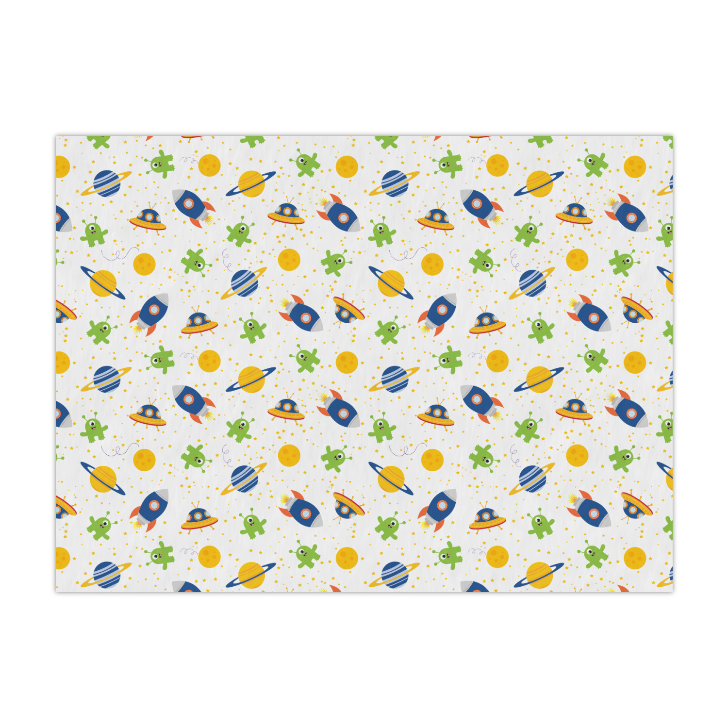 Explore another galaxy with this whimsical space design. Fun colors of blue, orange, yellow, and green make this space exploration come alive. The design is full of little green martians, blue and orange rockets, blue, yellow, and orange spaceships, yellow and blue planets, and yellow stars galore.