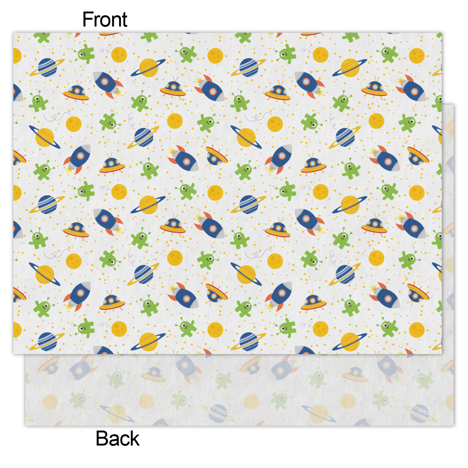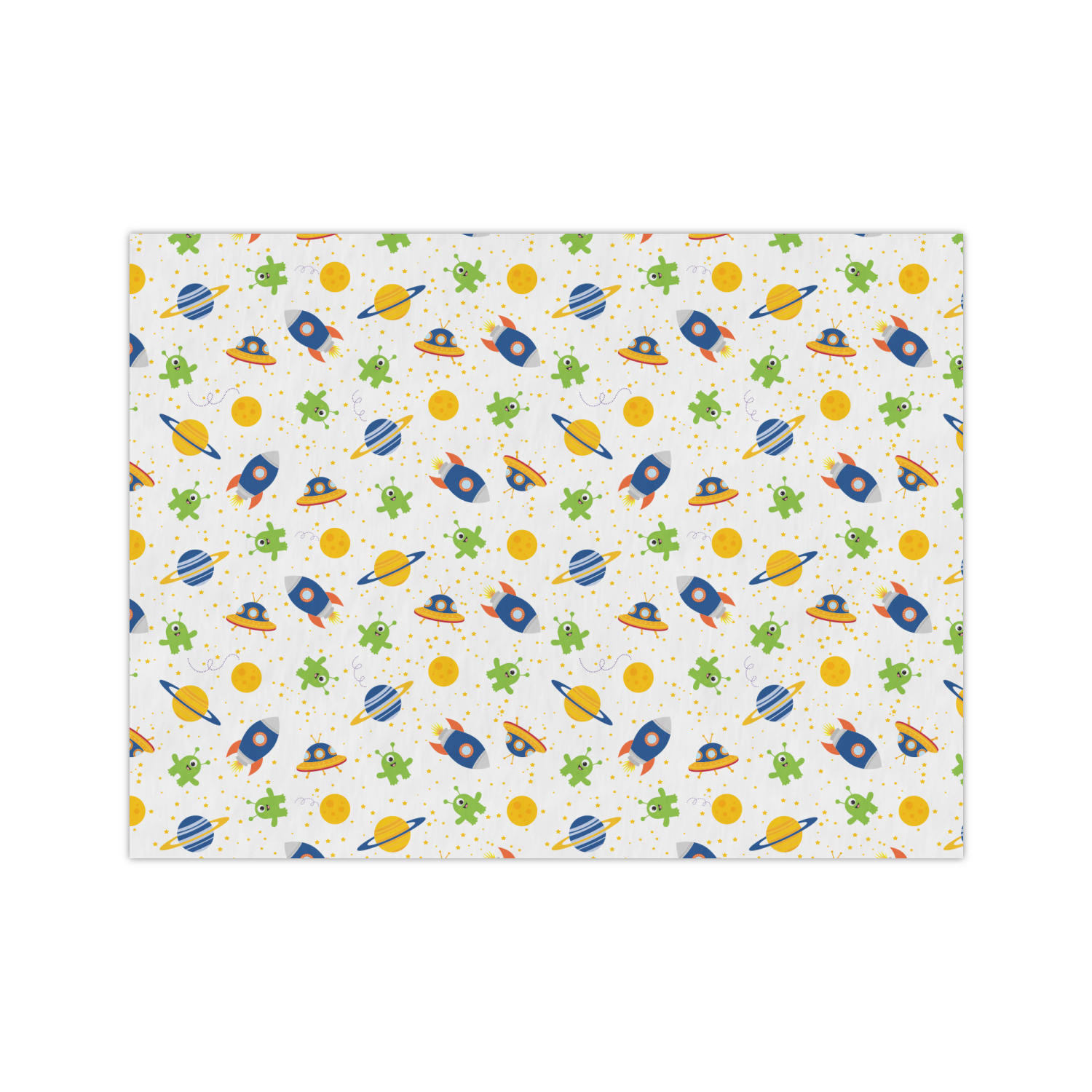 Explore another galaxy with this whimsical space design. Fun colors of blue, orange, yellow, and green make this space exploration come alive. The design is full of little green martians, blue and orange rockets, blue, yellow, and orange spaceships, yellow and blue planets, and yellow stars galore.