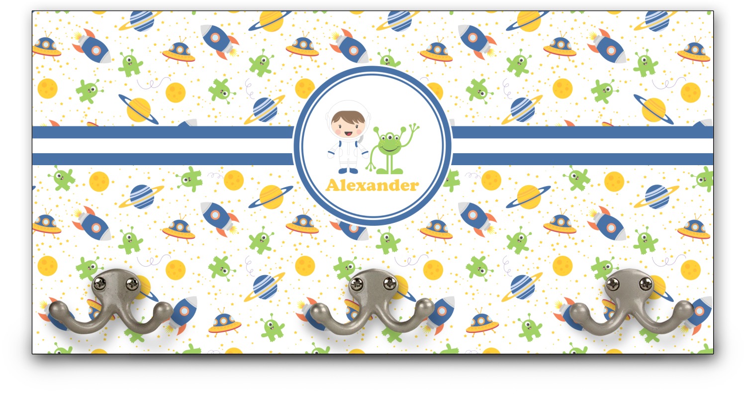 This coat rack is the perfect way to add some personality to your wall or entryway. The board is made of a strong maple that is approximately 16" x 8". The three 2-prong hooks are a sturdy metal that have three screws attaching them to the board. Your design is printed right onto the front of the board while the back and sides are a simple black.