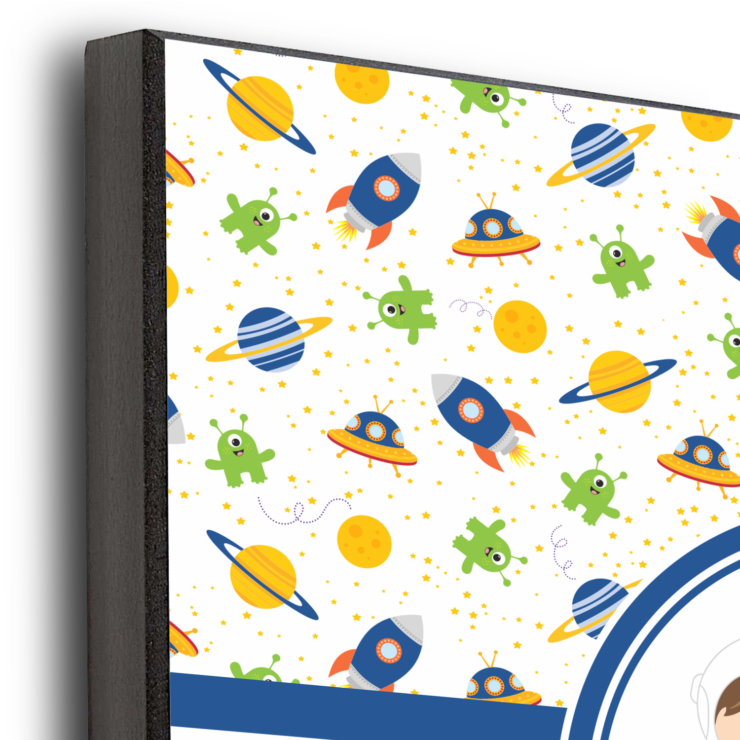 A blue and white band is placed in the middle of the design and used to showcase your little space traveler and his martian buddy. Add your own personalization for that special touch.
