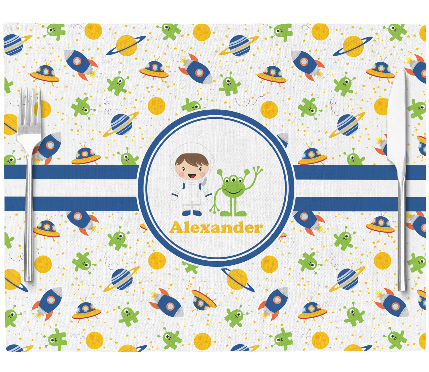 A blue and white band is placed in the middle of the design and used to showcase your little space traveler and his martian buddy. Add your own personalization for that special touch.