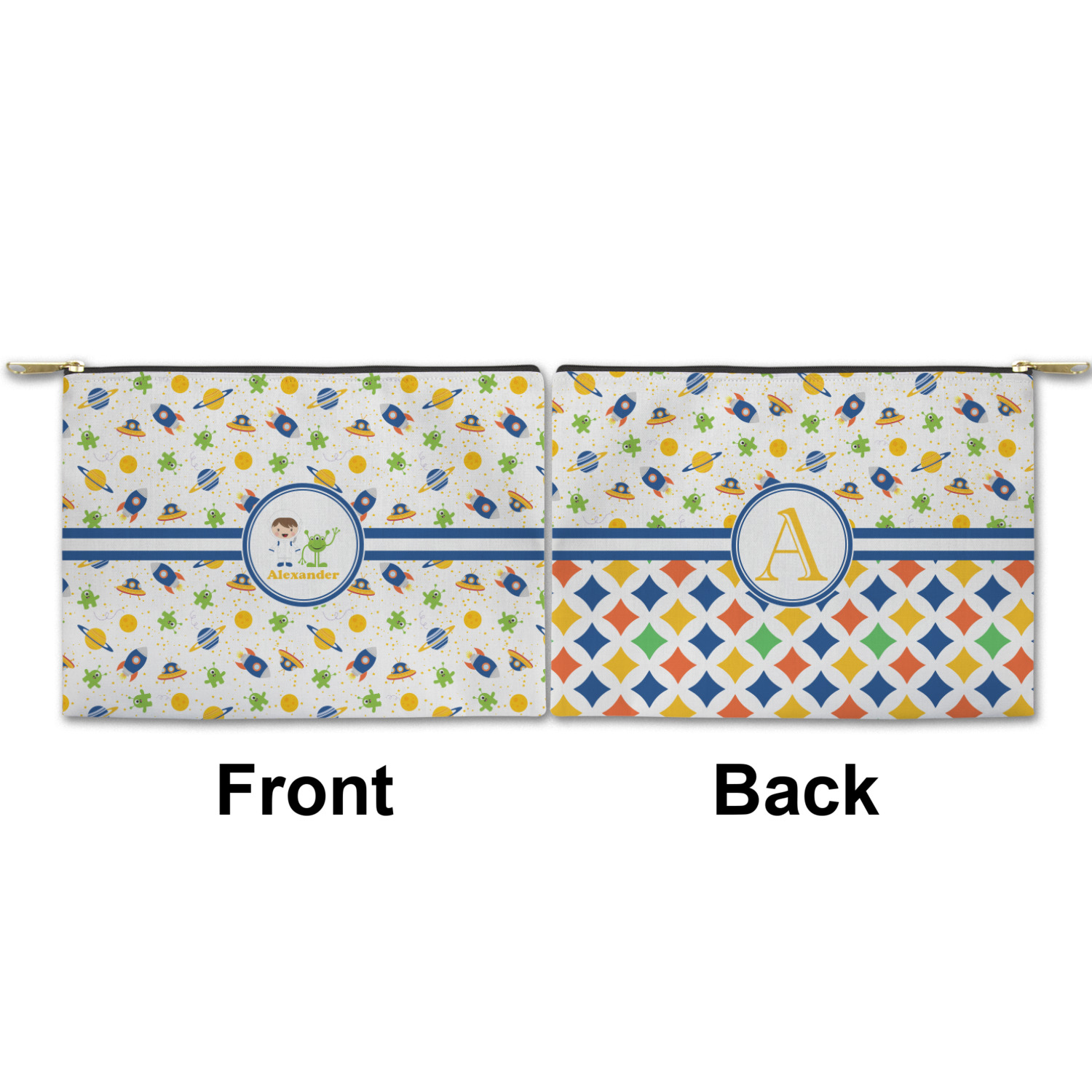 You can design both the front and the back of the pouch - same design, two complementary designs or two totally different designs - the choice is yours! We offer many different personalization styles i.e. name, name & initial, monograms - so the choice to personalize is also yours.