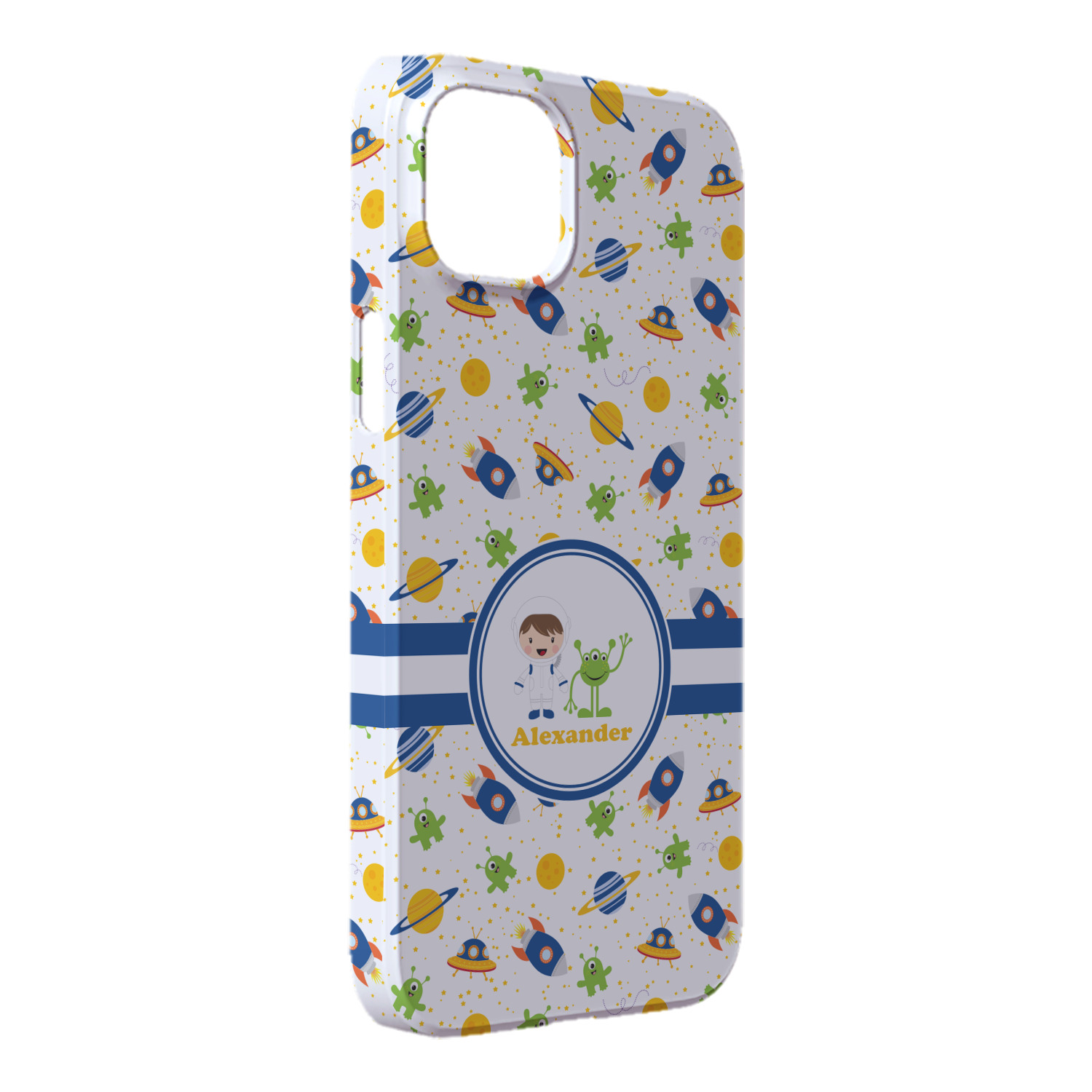 A blue and white band is placed in the middle of the design and used to showcase your little space traveler and his martian buddy. Add your own personalization for that special touch.