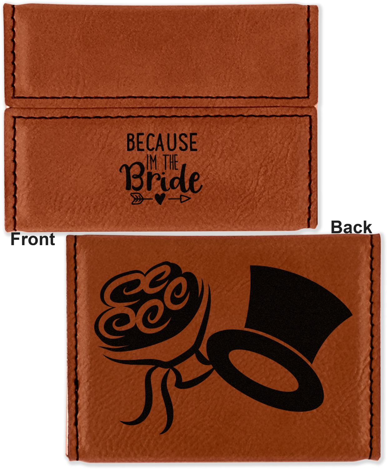 Your personalized design is laser engraved onto either the front, or the front and back of the card holder, depending on the model you purchase. Once engraved, the design will appear a darkened black against the cognac color of the leatherette.